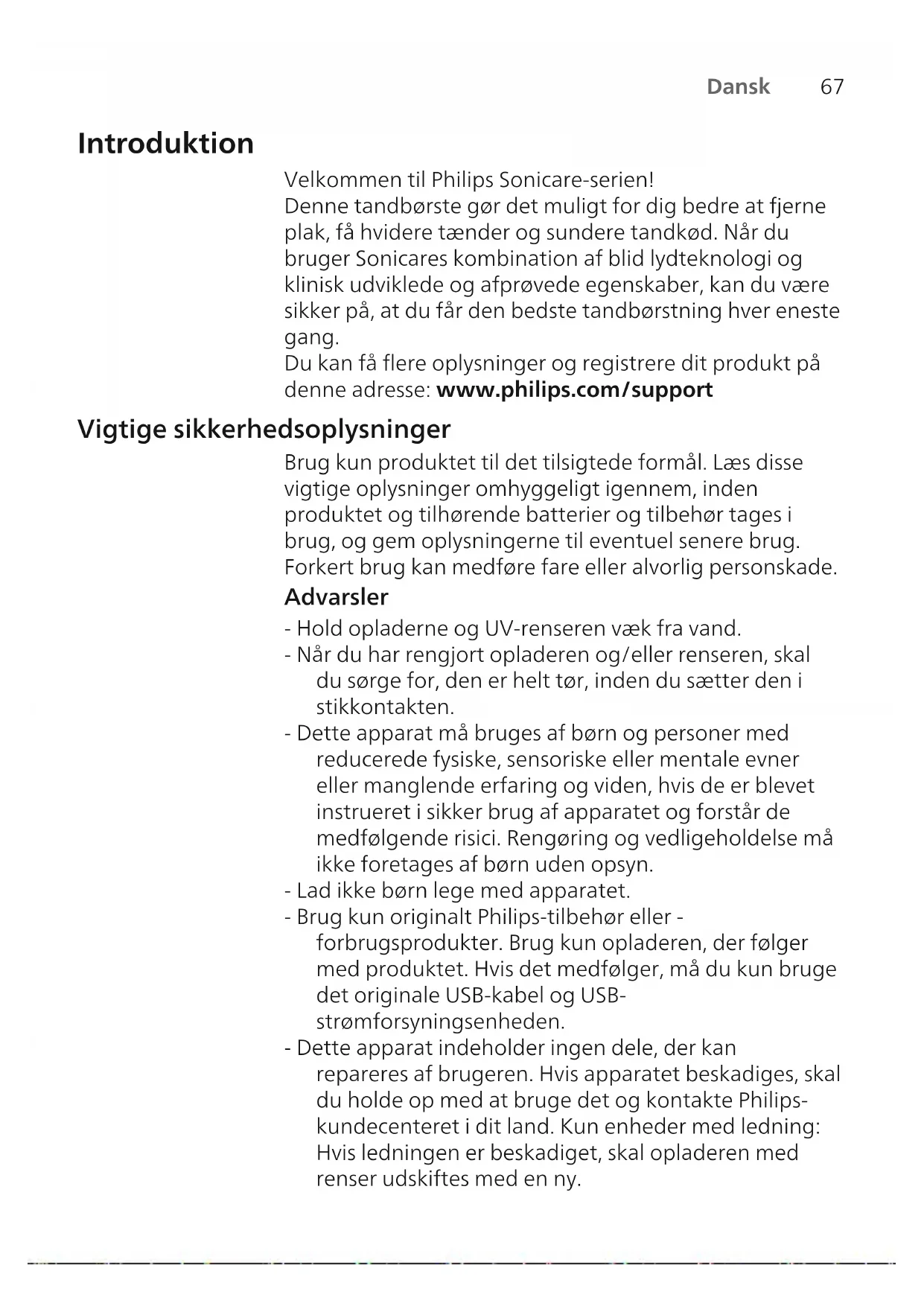 Dansk Introduktion Velkommen til Philips Sonicare-serien! Denne tandbørste gør det muligt for dig bedre at fjerne plak, få hvidere tænder og sundere tandkød. Når du bruger Sonicares kombination af blid lydteknologi og klinisk udviklede og afprøvede egenskaber, kan du være sikker på, at du får den bedste tandbørstning hver eneste gang. Du kan få flere oplysninger og registrere dit produkt på denne adresse: www.philips.com/support Vigtige sikkerhedsoplysninger Brug kun produktet til det tilsigtede formål. Læs disse vigtige oplysninger omhyggeligt igennem, inden produktet og tilhørende batterier og tilbehør tages i brug, og gem oplysningerne til eventuel senere brug. Forkert brug kan medføre fare eller alvorlig personskade. Advarsler - Hold opladerne og UV-renseren væk fra vand. - Når du har rengjort opladeren og/eller renseren, skal du sørge for, den er helt tør, inden du sætter den i stikkontakten. - Dette apparat må bruges af børn og personer med reducerede fysiske, sensoriske eller mentale evner eller manglende erfaring og viden, hvis de er blevet instrueret i sikker brug af apparatet og forstår de medfølgende risici. Rengøring og vedligeholdelse må ikke foretages af børn uden opsyn. - Lad ikke børn lege med apparatet. - Brug kun originalt Philips-tilbehør eller - forbrugsprodukter. Brug kun opladeren, der følger med produktet. Hvis det medfølger, må du kun bruge det originale USB-kabel og USB- strømforsyningsenheden. - Dette apparat indeholder ingen dele, der kan repareres af brugeren. Hvis apparatet beskadiges, skal du holde op med at bruge det og kontakte Philips- kundecenteret i dit land. Kun enheder med ledning: Hvis ledningen er beskadiget, skal opladeren med renser udskiftes med en ny.68 Dansk - Opladeren og/eller renseren må ikke bruges udendørs eller tæt på varme overflader. - Hverken dele eller tilbehør til produktet må kommes i opvaskemaskinen. - Apparatet er kun beregnet til renholdelse af tænder, tandkød og tunge. - Hold altid renseren uden for børns rækkevidde. - Stop med at bruge renseren, hvis det ultraviolette lys forbliver tændt, når lågen åbnes. Ultraviolet lys kan være skadeligt for øjne og hud. - Betjen kun renseren med beskyttelsesskærmen på plads. - Rør ikke ved UV-renserens ultraviolette pære, når den er varm. - Stop med at bruge et børstehoved, der har ødelagte eller bøjede børstehår. Udskift børstehovedet hver 3. måned, eller så snart de første tegn på slitage viser sig. - Undgå direkte kontakt med produkter, der indeholder æteriske olier eller kokosolie. Kontakt kan resultere i, at der falder totter af børsten. - Stop med at bruge apparatet, og kontakt din tandlæge/læge, hvis der opstår kraftig blødning efter brug, hvis blødningen fortsætter efter 1 uges brug, eller hvis du oplever ubehag eller smerter. - Hvis du er blevet opereret i mund eller tandkød inden for de seneste 2 måneder, skal du spørge din tandlæge til råds, før du bruger apparatet. - Hvis du har en pacemaker eller andre implantater, skal du kontakte din læge eller producenten af implantatet inden brug. - Hvis du har helbredsproblemer, skal du spørge din læge til råds, før du begynder at bruge dette apparat. - Dette produkt er beregnet til personlig hjemmebrug og ikke til brug af et større antal patienter på tandlægeklinikker eller institutioner. Sikkerhedsinstruktioner for batterier - Dette apparat indeholder batterier, som kun må fjernes af fagfolk69 Dansk - Brug kun produktet til det tilsigtede formål. Læs disse oplysninger omhyggeligt igennem, inden produktet og tilhørende batterier og tilbehør tages i brug, og gem oplysningerne til eventuel senere brug. Forkert brug kan medføre fare eller alvorlig personskade. Det medfølgende tilbehør kan variere for forskellige produkter. - Brug kun originalt Philips-tilbehør og forbrugsprodukter. Brug kun den aftagelige forsyningsenhed TCBxxxx, HX6100, HX6110, HX6160 eller WAAxxxx. - Hold produktet og batterierne væk fra ild, og udsæt dem ikke for direkte sollys eller høje temperaturer. - Hvis produktet bliver unormalt varmt eller lugtende, ændrer farve, eller opladningen tager længere end normalt, skal du ophøre med at bruge og oplade produktet og kontakte Philips. - Du må ikke komme produkter og deres batterier i mikroovne eller placere dem på induktionskogeplader. - For at forhindre, at batterierne overophedes eller afgiver giftstoffer eller farlige substanser, må du ikke åbne, ændre eller slå hul på, beskadige eller skille produktet eller batteriet ad. Batterierne må ikke kortsluttes, overoplades eller udsættes for omvendt elektrisk ladning. - Dette apparat indeholder batterier, der ikke kan udskiftes. Når batteriet har nået enden af sin levetid, skal apparatet bortskaffes på korrekt vis. Se afsnittet om genanvendelse. - Hvis batterierne er ødelagt eller lækker, skal du undgå kontakt med hud og øjne. Hvis dette sker, skal du straks skylle grundigt med vand og søge lægehjælp. - Når du håndterer batterier, skal du sørge for, at dine hænder, produktet og batterierne er tørre. - For at undgå en utilsigtet kortslutning af batterierne efter fjernelse, må du ikke lade batteripolerne komme i kontakt med metalgenstande (f.eks. mønter, hårnåle, ringe). Batterierne må ikke pakkes ind i aluminiumsfolie. Sæt tape på batteripolerne, eller læg batterierne i en plastikpose, før du kasserer dem.70 Dansk - Oplad, brug og opbevar produktet ved en temperatur mellem 0 °C og 40 °C (32 °F og 104 °F). Opbevarings- og transportbetingelser Temperatur -10°C til 60°C. Elektromagnetiske felter (EMF) Dette Philips-apparat overholder alle branchens gældende standarder og regler angående eksponering for elektromagnetiske felter. Direktiv om radioudstyr Hermed erklærer Philips, at elektriske tandbørster med radioudstyrstype (Bluetooth, NFC) er i overensstemmelse med direktiv 2014/53/EU. - Bluetooth-radiogrænsefladen i relevante produkter 