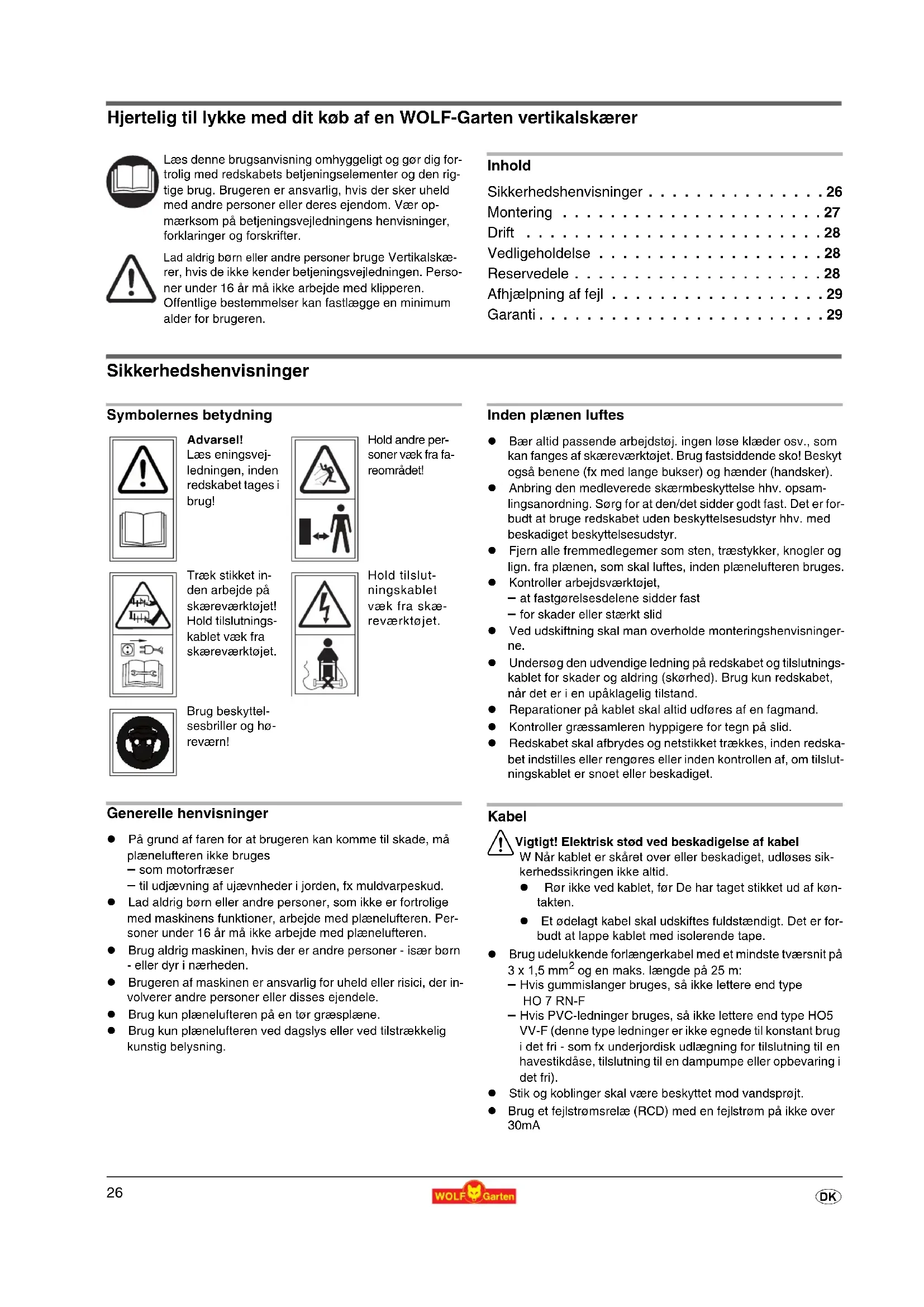 d Hjertelig til lykke med dit køb af en WOLF-Garten vertikalskærer Inhold Sikkerhedshenvisninger . . . . . . . . . . . . . . . 26 Montering