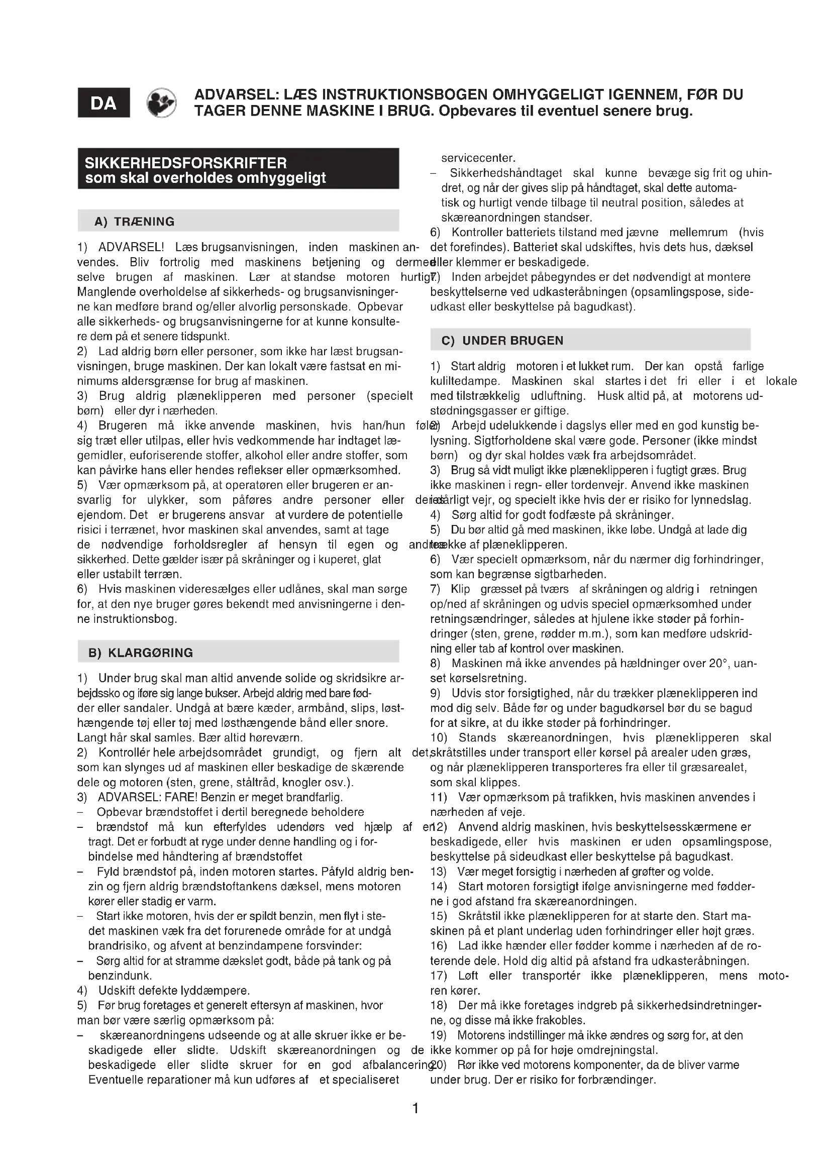 1) ADVARSEL! Læs brugsanvisningen, inden maskinen an- vendes. Bliv fortrolig med maskinens betjening og dermed selve brugen af maskinen. Lær at standse motoren hurtigt. Manglende overholdelse af sikkerheds- og brugsanvisninger- ne kan medføre brand og/eller alvorlig personskade. Opbevar alle sikkerheds- og brugsanvisningerne for at kunne konsulte- re dem på et senere tidspunkt. 2) Lad aldrig børn eller personer, som ikke har læst brugsan- visningen, bruge maskinen. Der kan lokalt være fastsat en mi- nimums aldersgrænse for brug af maskinen. 3) Brug aldrig plæneklipperen med personer (specielt børn) eller dyr i nærheden. 4) Brugeren må ikke anvende maskinen, hvis han/hun føler sig træt eller utilpas, eller hvis vedkommende har indtaget læ- gemidler, euforiserende stoer, alkohol eller andre stoer, som kan påvirke hans eller hendes reekser eller opmærksomhed. 5) Vær opmærksom på, at operatøren eller brugeren er an- svarlig for ulykker, som påføres andre personer eller deres ejendom. Det er brugerens ansvar at vurdere de potentielle risici i terrænet, hvor maskinen skal anvendes, samt at tage de nødvendige forholdsregler af hensyn til egen og andres sikkerhed. Dette gælder især på skråninger og i kuperet, glat eller ustabilt terræn. 6) Hvis maskinen videresælges eller udlånes, skal man sørge for, at den nye bruger gøres bekendt med anvisningerne i den- ne instruktionsbog.