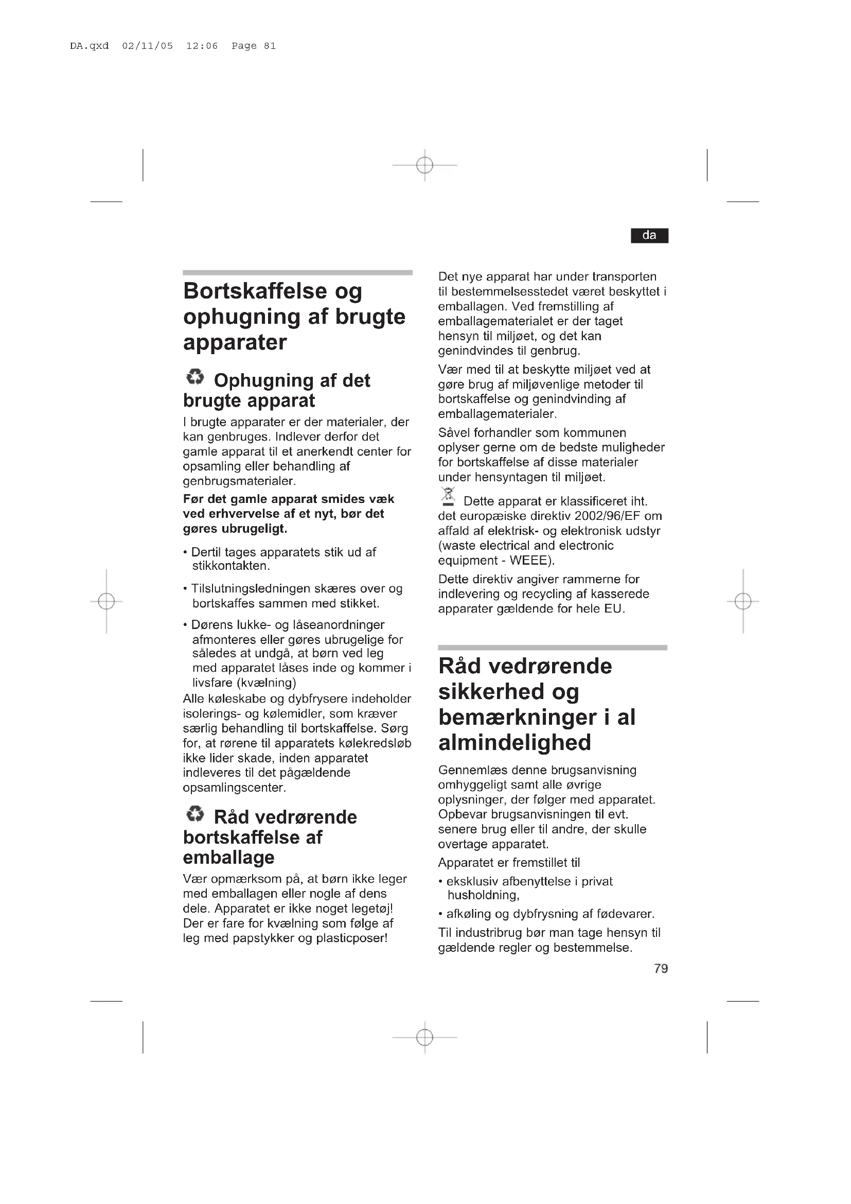- Dørens lukke- og låseanordninger afmonteres eller gøres ubrugelige for således at undgå, at børn ved leg med apparatet låses inde og kommer i livsfare (kvælning) Alle køleskabe og dybfrysere indeholder isolerings- og kølemidler, som kræver særlig behandling til bortskaffelse. Sørg for, at rørene til apparatets kølekredsløb ikke lider skade, inden apparatet indleveres til det pågældende opsamlingscenter. Råd vedrørende bortskaffelse af emballage Vær opmærksom på, at børn ikke leger med emballagen eller nogle af dens dele. Apparatet er ikke noget legetøj! Der er fare for kvælning som følge af leg med papstykker og plasticposer! Det nye apparat har under transporten til bestemmelsesstedet været beskyttet i emballagen. Ved fremstilling af emballagematerialet er der taget hensyn til miljøet, og det kan genindvindes til genbrug. Vær med til at beskytte miljøet ved at gøre brug af miljøvenlige metoder til bortskaffelse og genindvinding af emballagematerialer. Såvel forhandler som kommunen oplyser gerne om de bedste muligheder for bortskaffelse af disse materialer under hensyntagen til miljøet. Dette apparat er klassificeret iht. det europæiske direktiv 2002/96/EF om affald af elektrisk- og elektronisk udstyr (waste electrical and electronic equipment - WEEE). Dette direktiv angiver rammerne for indlevering og recycling af kasserede apparater gældende for hele EU. Råd vedrørende sikkerhed og bemærkninger i al almindelighed Gennemlæs denne brugsanvisning omhyggeligt samt alle øvrige oplysninger, der følger med apparatet. Opbevar brugsanvisningen til evt. senere brug eller til andre, der skulle overtage apparatet. Apparatet er fremstillet til