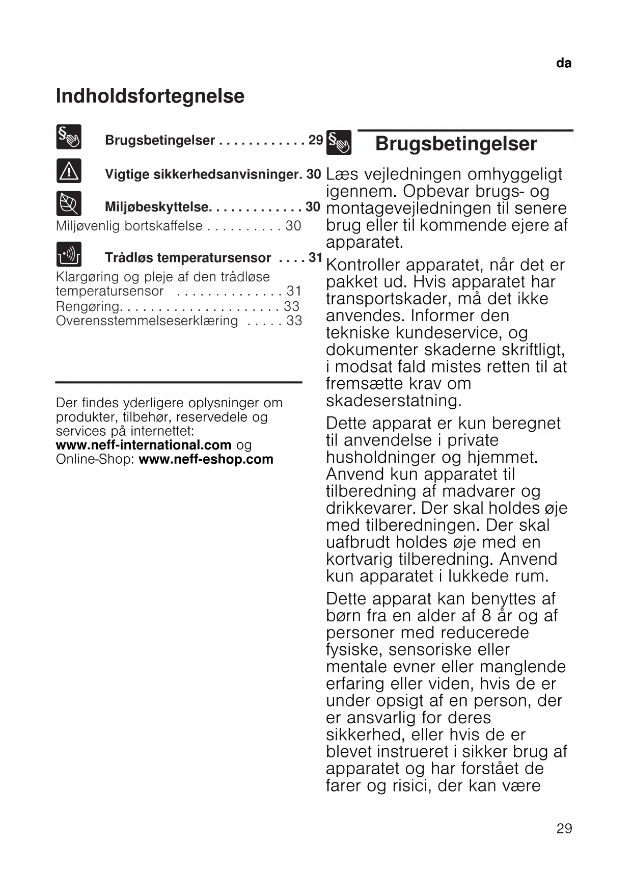 - Overensstemmelseserklæring Produktinfo Der findes yderligere oplysninger om produkter, tilbehør, reservedele og services på internettet: www.neff-international.com og Online-Shop: www.neff-eshop.com 8 Brugsbetingelser Brugsbetingelser Læs vejledningen omhyggeligt igennem. Opbevar brugs- og montagevejledningen til senere brug eller til kommende ejere af apparatet. Kontroller apparatet, når det er pakket ud. Hvis apparatet har transportskader, må det ikke anvendes. Informer den tekniske kundeservice, og dokumenter skaderne skriftligt, i modsat fald mistes retten til at fremsætte krav om skadeserstatning. Dette apparat er kun beregnet til anvendelse i private husholdninger og hjemmet. Anvend kun apparatet til tilberedning af madvarer og drikkevarer. Der skal holdes øje med tilberedningen. Der skal uafbrudt holdes øje med en kortvarig tilberedning. Anvend kun apparatet i lukkede rum. Dette apparat kan benyttes af børn fra en alder af 8 år og af personer med reducerede fysiske, sensoriske eller mentale evner eller manglende erfaring eller viden, hvis de er under opsigt af en person, der er ansvarlig for deres sikkerhed, eller hvis de er blevet instrueret i sikker brug af apparatet og har forstået de farer og risici, der kan væreda p. 33