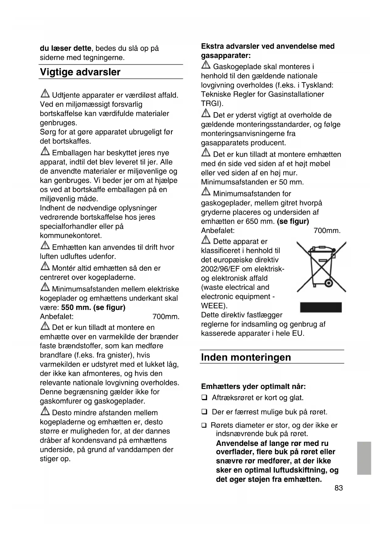 du læser dette, bedes du slå op på siderne med tegningerne. Vigtige advarsler Udtjente apparater er værdiløst affald. Ved en miljømæssigt forsvarlig bortskaffelse kan værdifulde materialer genbruges. Sørg for at gøre apparatet ubrugeligt før det bortskaffes. Emballagen har beskyttet jeres nye apparat, indtil det blev leveret til jer. Alle de anvendte materialer er miljøvenlige og kan genbruges. Vi beder jer om at hjælpe os ved at bortskaffe emballagen på en miljøvenlig måde. Indhent de nødvendige oplysninger vedrørende bortskaffelse hos jeres specialforhandler eller på kommunekontoret. Emhætten kan anvendes til drift hvor luften udluftes udenfor. Montér altid emhætten så den er centreret over kogepladerne. Minimumsafstanden mellem elektriske kogeplader og emhættens underkant skal være: 550 mm. (se figur) Anbefalet: 700mm. Det er kun tilladt at montere en emhætte over en varmekilde der brænder faste brændstoffer, som kan medføre brandfare (f.eks. fra gnister), hvis varmekilden er udstyret med et lukket låg, der ikke kan afmonteres, og hvis den relevante nationale lovgivning overholdes. Denne begrænsning gælder ikke for gaskomfurer og gaskogeplader. Desto mindre afstanden mellem kogepladerne og emhætten er, desto større er muligheden for, at der dannes dråber af kondensvand på emhættens underside, på grund af vanddampen der stiger op. Ekstra advarsler ved anvendelse med gasapparater: Gaskogeplade skal monteres i henhold til den gældende nationale lovgivning overholdes (f.eks. i Tyskland: Tekniske Regler for Gasinstallationer TRGI). Det er yderst vigtigt at overholde de gældende monteringsstandarder, og følge monteringsanvisningerne fra gasapparatets producent. Det er kun tilladt at montere emhætten med én side ved siden af et højt møbel eller ved siden af en høj mur. Minimumsafstanden er 50 mm. Minimumsafstanden for gaskogeplader, mellem gitret hvorpå gryderne placeres og undersiden af emhætten er 650 mm. (se figur) Anbefalet: 700mm. Dette apparat er klassificeret i henhold til det europæiske direktiv 2002/96/EF om elektrisk- og elektronisk affald (waste electrical and electronic equipment - WEEE). Dette direktiv fastlægger reglerne for indsamling og genbrug af kasserede apparater i hele EU. Inden monteringen Emhætters yder optimalt når: Aftræksrøret er kort og glat. Der er færrest mulige buk på røret. Rørets diameter er stor, og der ikke er indsnævrende buk på røret. Anvendelse af lange rør med ru overflader, flere buk på røret eller snævre rør medfører, at der ikke sker en optimal luftudskiftning, og det øger støjen fra emhætten.84