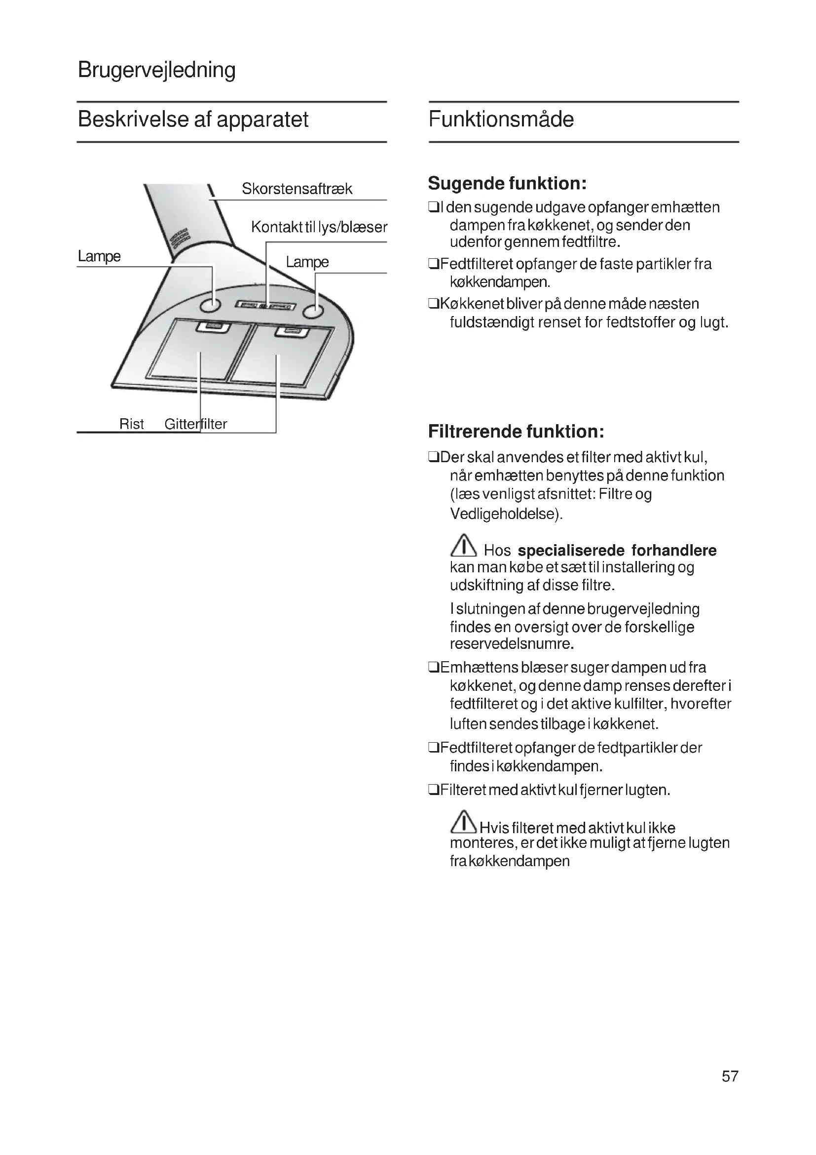 kytke virta päälle sähköpääkeskuksesta. Ongelmatilanteessa Jos sinulla on kysyttävää tai vian tapauksessa, ota yhteyttä Asiakaspalveluun. (Katso Asiakaspalvelun edustajaluettelo). Soittaessasi anna seuraavat tiedot:: E-Nr. FD Kirjoita asianmukaiset numerot yllä olevaan ruudukkoon. E-Nr. (tuotekoodi) ja FD (valmistuspäivä) löytyvät arvokilvessä, joka tulee näkyviin liesituulettimen sisältä sen jälkeen, kun suodattimen kehys on poistettu.57 Brugervejledning Funktionsmåde Sugende funktion: ❑ I den sugende udgave opfanger emhætten dampen fra køkkenet, og sender den udenfor gennem fedtfiltre. ❑ Fedtfilteret opfanger de faste partikler fra køkkendampen. ❑ Køkkenet bliver på denne måde næsten fuldstændigt renset for fedtstoffer og lugt. Filtrerende funktion: ❑ Der skal anvendes et filter med aktivt kul, når emhætten benyttes på denne funktion (læs venligst afsnittet: Filtre og Vedligeholdelse). Hos specialiserede forhandlere kan man købe et sæt til installering og udskiftning af disse filtre. I slutningen af denne brugervejledning findes en oversigt over de forskellige reservedelsnumre. ❑ Emhættens blæser suger dampen ud fra køkkenet, og denne damp renses derefter i fedtfilteret og i det aktive kulfilter, hvorefter luften sendes tilbage i køkkenet. ❑ Fedtfilteret opfanger de fedtpartikler der findes i køkkendampen. ❑ Filteret med aktivt kul fjerner lugten. Hvis filteret med aktivt kul ikke monteres, er det ikke muligt at fjerne lugten fra køkkendampen Skorstensaftræk Kontakt til lys/blæser Lampe Lampe Beskrivelse af apparatet Rist Gitterfilter58 Før apparatet tages i brug første gang Vigtige bemærkninger: ❑ Brugervejledningen er gældende for flere forskellige udgaver af dette apparat. Derfor er det muligt at finde beskrivelser af enkelte komponenter, der ikke henviser til det købte apparat. ❑ Denne sugende emhætte er fremstillet i overensstemmelse med alle grundlæggende sikkerhedsstandarder. Eventuelle reparationer må udelukkende udføres af kvalificerede teknikere. Forkerte reparationer kan udsætte brugeren for alvorlig fare. ❑ Før husholdningsapparatet benyttes første gang, skal man læse brugervejledningen omhyggeligt. Denne vejledning indeholder vigtige oplysninger for den personlige sikkerhed, samt til beskyttelse af apparatet. ❑ Vejledningen til montering og brug skal opbevares og overdrages til eventuelle senere brugere. Sørg for at emballeringsmaterialet bortskaffes korrekt (læs venligst installeringsvejledningen). Denne sugende emhætte er udelukkende udviklet til brug i almindelig husholdning. Før der udføres nogen form for rengøring eller vedligeholdelse, skal emhætten afbrydes fra elnettet ved at trække stikket ud, eller ved at afbryde hovedafbryderen i hjemmet. Apparatet må ikke benyttes af børn, eller af personer med nedsatte sanseevner eller mentale færdigheder, eller uden den nødvendige erfaring og kendskab, med mindre brugen sker under opsyn eller vejledning fra en person der har ansvaret for deres sikkerhed. Børn skal holdes under opsyn, så de ikke får mulighed for at lege med emhætten. Emhætten må aldrig benyttes uden korrekt monteret rist! Emhætten må ALDRIG benyttes som støtteoverflade, med mindre dette er udtrykkeligt tilladt. Lokalet skal have tilstrækkelig ventilation, når køkkenemhætten anvendes samtidigt med andre apparater der forbrænder gas eller andre brændstoffer. Den opsugede luft må ikke ledes ind i rør, der anvendes til udledning af røg fra apparater med forbrænding af gas eller af andre brændstoffer. Det er strengt forbudt at flambere under emhætten. Brug af åben ild er farligt for filtrene og kan medføre brand, og skal derfor altid undgås. Friturestegning skal ske under opsyn for at forhindre, at den overopvarmede olie bryder i brand. Hvad angår de nødvendige tekniske forholdsregler og sikkerhedskrav for udledning af røg, skal alle reglementer fra de lokale myndigheder overholdes uden undtagelse. Emhætten skal rengøres ofte, både indvendigt og udvendigt (MINDST EN GANG OM MÅNEDEN; overhold under alle omstændigheder angivelserne i kapitlet om vedligeholdelse i denne vejledning). Manglende overholdelse af kravene for rengøring af emhætten, og for udskiftning og rengøring af filtrene, medfører brandfare.59 Gasblus og elplader En kogeflade med gasblus må ikke anvendes med alle blus tændt og på max effekt i mere end 15 minutter, ellers kan der opstå fare for at emhættens overflader overopvarmes, og man kan brænde sig, hvis man rører ved emhætten. Desuden kan emhætten blive beskadiget. Hvis der anvendes flere end 3 gasblus, skal emhætten indstilles på max effekt. ❑ Bemærk: et stort blus med effekt over 5 KW (fx WOK)svarer til 2 standard-blus. ❑ Gasblussene må aldrig være tændt uden gryder eller pander ovenpå. Reguler flammen, så den ikke rager ud fra grydebundens omkreds. Emhætten må hverken benyttes eller efterlades uden korrekt indsatte lyspærer pga. fare for elektrisk stød. Fabrikanten fralægger sig ethvert ansvar for eventuelle fejl, skader eller brand forårsaget af apparatet, men afledt af manglende overholdelse af instruktionerne i denne vejledning.60 Betjening Følgende metode er den mest effektive til fjernelse af damp fra madlavning: ❑ Tænd emhætten, så snart madlavningen påbegyndes. ❑ Sluk først emhætten nogle minutter efter at madlavningen er ophørt. Sådan tændes emhætten: ❑ Skub højre skydekontakt på den ønskede hastighed. Sådan slukkes emhætten: ❑ Skub højre skydekontakt tilbage på 0. Belysning: ❑ Lampen kan tændes, når som helst, også selvom blæseren er slukket. Filtre og vedligeholdelse Obs! Inden der udføres nogen form for rengøring eller vedligeholdelse skal emhætten afbrydes fra elnettet ved at fjerne stikket fra stikkontakten, eller ved at afbryde hjemmets hovedafbryder. Fedtfiltre: Fedtfiltrene af metal anvendes til at opfange fedtpartikler i dampene, der dannes und