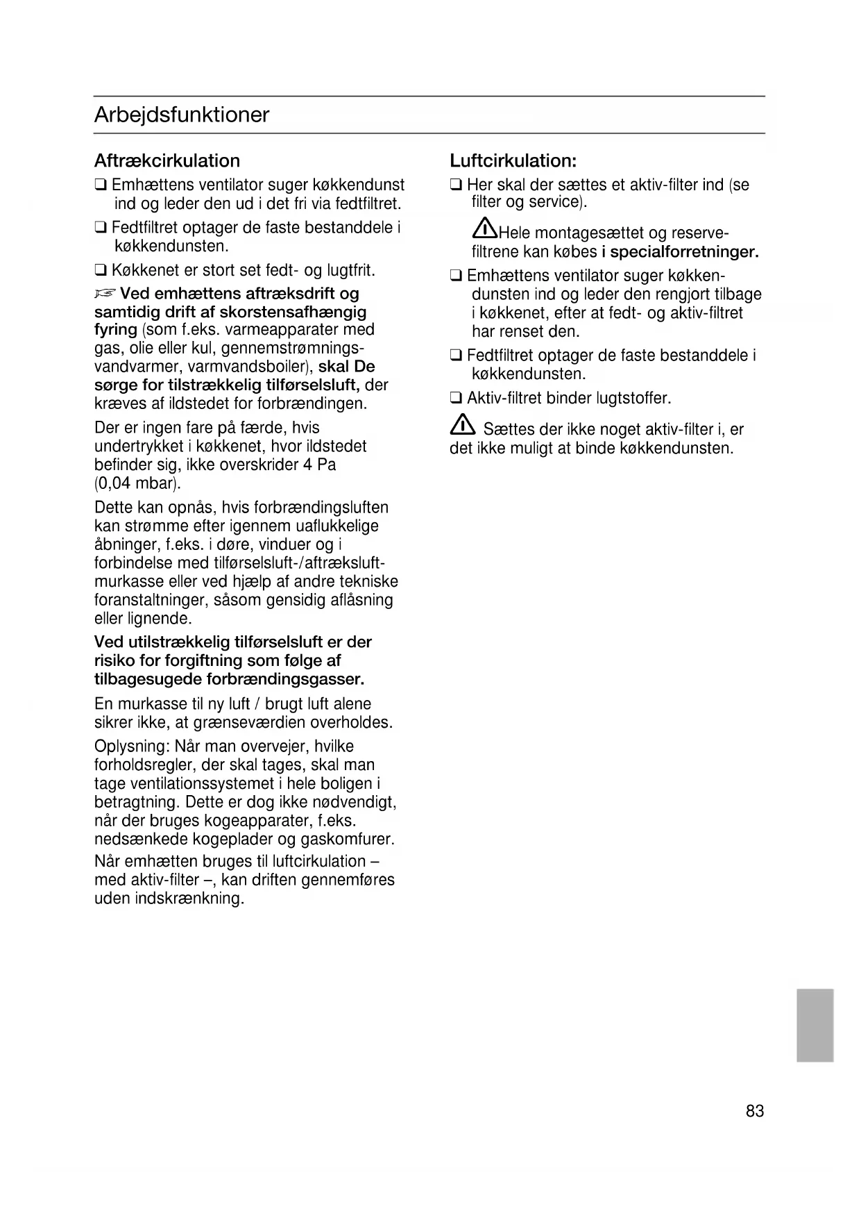 Ved emhættens aftræksdrift og samtidig drift af skorstensafhængig fyring (som f.eks. varmeapparater med gas, olie eller kul, gennemstrømnings- vandvarmer, varmvandsboiler), skal De sørge for tilstrækkelig tilførselsluft, der kræves af ildstedet for forbrændingen. Der er ingen fare på færde, hvis undertrykket i køkkenet, hvor ildstedet befinder sig, ikke overskrider 4 Pa (0,04 mbar). Dette kan opnås, hvis forbrændingsluften kan strømme efter igennem uaflukkelige åbninger, f.eks. i døre, vinduer og i forbindelse med tilførselsluft-/aftræksluft- murkasse eller ved hjælp af andre tekniske foranstaltninger, såsom gensidig aflåsning eller lignende. Ved utilstrækkelig tilførselsluft er der risiko for forgiftning som følge af tilbagesugede forbrændingsgasser. En murkasse til ny luft / brugt luft alene sikrer ikke, at grænseværdien overholdes. Oplysning: Når man overvejer, hvilke forholdsregler, der skal tages, skal man tage ventilationssystemet i hele boligen i betragtning. Dette er dog ikke nødvendigt, når der bruges kogeapparater, f.eks. nedsænkede kogeplader og gaskomfurer. Når emhætten bruges til luftcirkulation – med aktiv-filter –, kan driften gennemføres uden indskrænkning. Luftcirkulation: ❑ Her skal der sættes et aktiv-filter ind (se filter og service). Hele montagesættet og reserve- filtrene kan købes i specialforretninger. ❑ Emhættens ventilator suger køkken- dunsten ind og leder den rengjort tilbage i køkkenet, efter at fedt- og aktiv-filtret har renset den. ❑ Fedtfiltret optager de faste bestanddele i køkkendunsten. ❑ Aktiv-filtret binder lugtstoffer. Sættes der ikke noget aktiv-filter i, er det ikke muligt at binde køkkendunsten.84 Inden emhætten tages i brug for første gang Vigtige henvisninger: ❑ Denne brugsanvisning gælder for flere modeller. Det kan være, at specielle udstyrsdetaljer er beskrevet, som ikke findes på din emhætte. ❑ Denne emhætte opfylder de gældende sikkerhedsbestemmelser. Reparationer må kun udføres af fagfolk. Ufagligt udførte reparationer kan være til stor fare for den, der benytter apparatet. ❑ Du skal have læst brugsanvisningen grundigt igennem, før emhætten tages i brug. Den indeholder vigtige oplysninger om sikkerhed, brug og pleje. ❑ Opbevar brugsanvisningen et sikkert sted. Den kan være nyttig, hvis em hætten overtages af andre. Nedsænkede kogeplader med gas / gaskomfurer Brug ikke alle gas-kogeplader på en gang i lang tid (maks. 15 minutter) ved højeste varmebelastning, da overfladerne bliver varme og der derved er fare for forbrænding, hvis man berører overfladerne, eller fare for beskadigelse af emhætten. Er emhætten monteret over en gas- kogeplade, skal emhætten være indstillet på maks., hvis tre eller flere kogeplader bruges på samme tid. ❑ Dette apparat er klassificeret iht. det europæiske direktiv 2002/96/EF om affald af elektrisk- og elektronisk udstyr (waste electrical and electronic equipment – WEEE). Dette direktiv angiver rammerne for indlevering og recycling af kasserede apparater gældende for hele EU.