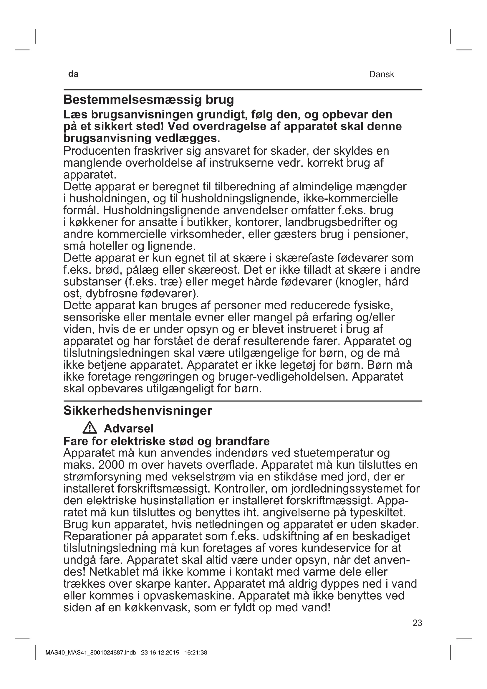 - Dansk Bestemmelsesmæssig brug Læs brugsanvisningen grundigt, følg den, og opbevar den på et sikkert sted! Ved overdragelse af apparatet skal denne brugsanvisning vedlægges. Producentenfraskriversigansvaretforskader,derskyldesen manglendeoverholdelseafinstruksernevedr.korrektbrugaf apparatet. Detteapparaterberegnettiltilberedningafalmindeligemængder ihusholdningen,ogtilhusholdningslignende,ikke-kommercielle formål.Husholdningslignendeanvendelseromfatterf.eks.brug ikøkkenerforansatteibutikker,kontorer,landbrugsbedrifterog andrekommerciellevirksomheder,ellergæstersbrugipensioner, småhotelleroglignende. Detteapparaterkunegnettilatskæreiskærefastefødevarersom f.eks.brød,pålægellerskæreost.Deterikketilladtatskæreiandre substanser(f.eks.træ)ellermegethårdefødevarer(knogler,hård ost,dybfrosnefødevarer). Detteapparatkanbrugesafpersonermedreduceredefysiske, sensoriskeellermentaleevnerellermangelpåerfaringog/eller viden,hvisdeerunderopsynogerblevetinstrueretibrugaf apparatetogharforståetdederafresulterendefarer.Apparatetog tilslutningsledningenskalværeutilgængeligeforbørn,ogdemå ikkebetjeneapparatet.Apparateterikkelegetøjforbørn.Børnmå ikkeforetagerengøringenogbruger-vedligeholdelsen.Apparatet skalopbevaresutilgængeligtforbørn. Sikkerhedshenvisninger W Advarsel Fare for elektriske stød og brandfare Apparatetmåkunanvendesindendørsvedstuetemperaturog maks.2000moverhavetsoverade.Apparatetmåkuntilsluttesen strømforsyningmedvekselstrømviaenstikdåsemedjord,derer installeretforskriftsmæssigt.Kontroller,omjordledningssystemetfor denelektriskehusinstallationerinstalleretforskriftmæssigt.Appa- ratetmåkuntilsluttesogbenyttesiht.angivelsernepåtypeskiltet. Brugkunapparatet,hvisnetledningenogapparateterudenskader. Reparationerpåapparatetsomf.eks.udskiftningafenbeskadiget tilslutningsledningmåkunforetagesafvoreskundeserviceforat undgåfare.Apparatetskalaltidværeunderopsyn,nårdetanven- des!Netkabletmåikkekommeikontaktmedvarmedeleeller trækkesoverskarpekanter.Apparatetmåaldrigdyppesnedivand ellerkommesiopvaskemaskine.Apparatetmåikkebenyttesved sidenafenkøkkenvask,somerfyldtopmedvand! MAS40_MAS41_8001024687.indb 23 16.12.2015 16:21:3824 da Dansk Indhold Tillykke med købet af dit nye apparat fra rmaet Bosch. Flere informationer om vores produkter ndes på vores internetside. Bestemmelsesmæssigbrug p. 23
