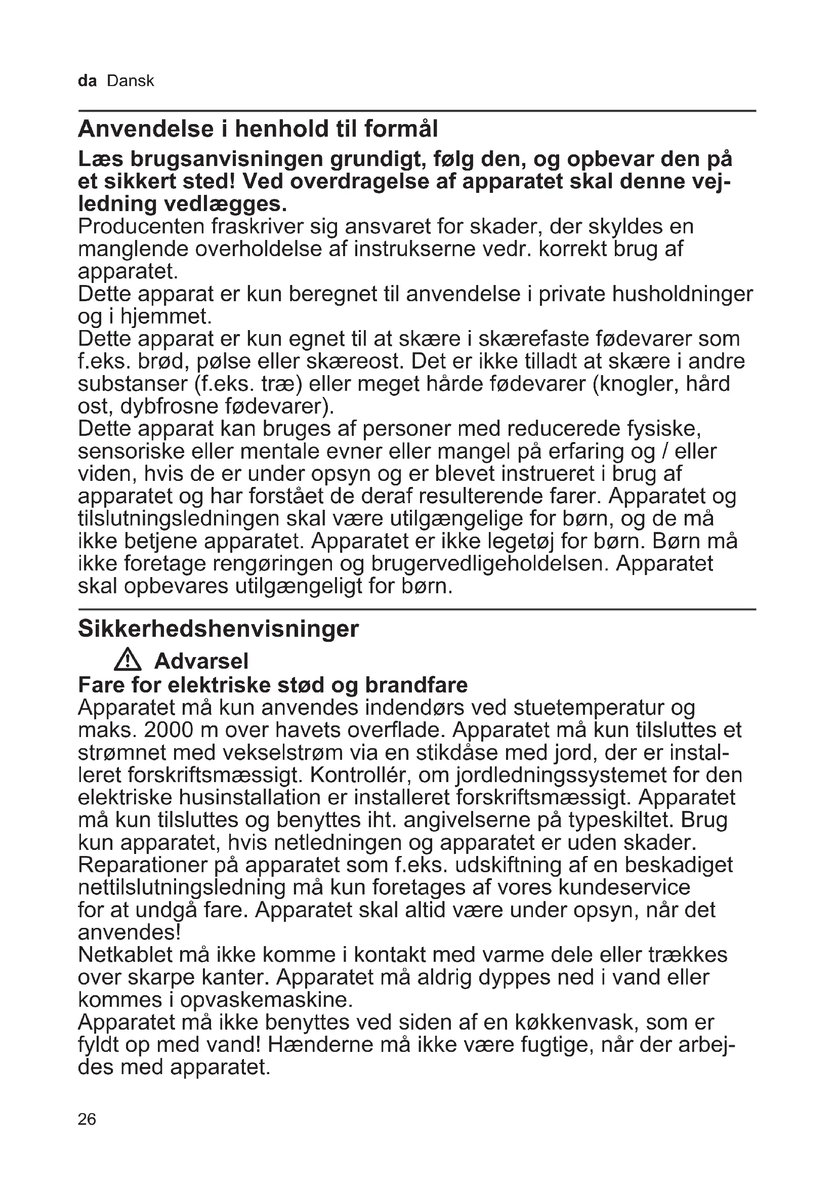 Gooi verpakkingsmateriaal op een milieuvriendelijke manier weg. Dit apparaat is gekenmerkt in overeen- stemming met de Europese richtlijn 2012/19/EU betreffende afgedankte elektrische en elektronische appara- tuur (waste electrical and electronic equipment – WEEE). De richtlijn geeft het kader aan voor de in de EU geldige terugneming en verwerking van oude apparaten. Raadpleeg uw gespecialiseerde handelaar voor de geldende voorschriften inzake afvalverwijdering. Garantie Voor dit apparaat gelden de garantie- voor-waarden die worden uitgegeven door de vertegenwoordiging van ons bedrijf in het land van aankoop. De leverancier, bij wie u het apparaat heeft gekocht, geeft u hierover graag meer informatie. Om aanspraak te maken op de garantie heeft u altijd uw aankoopbewijs nodig. Wijzigingen voorbehouden.26 da Dansk Anvendelse i henhold til formål Læs brugsanvisningen grundigt, følg den, og opbevar den på et sikkert sted! Ved overdragelse af apparatet skal denne vej- ledning vedlægges. Producenten fraskriver sig ansvaret for skader, der skyldes en manglende overholdelse af instrukserne vedr. korrekt brug af apparatet. Dette apparat er kun beregnet til anvendelse i private husholdninger og i hjemmet. Dette apparat er kun egnet til at skære i skærefaste fødevarer som f.eks. brød, pølse eller skæreost. Det er ikke tilladt at skære i andre substanser (f.eks. træ) eller meget hårde fødevarer (knogler, hård ost, dybfrosne fødevarer). Dette apparat kan bruges af personer med reducerede fysiske, sensoriske eller mentale evner eller mangel på erfaring og / eller viden, hvis de er under opsyn og er blevet instrueret i brug af apparatet og har forstået de deraf resulterende farer. Apparatet og tilslutningsledningen skal være utilgængelige for børn, og de må ikke betjene apparatet. Apparatet er ikke legetøj for børn. Børn må ikke foretage rengøringen og brugervedligeholdelsen. Apparatet skal opbevares utilgængeligt for børn. Sikkerhedshenvisninger W Advarsel Fare for elektriske stød og brandfare Apparatet må kun anvendes indendørs ved stuetemperatur og maks. 2000 m over havets overade. Apparatet må kun tilsluttes et strømnet med vekselstrøm via en stikdåse med jord, der er instal- leret forskriftsmæssigt. Kontrollér, om jordledningssystemet for den elektriske husinstallation er installeret forskriftsmæssigt. Apparatet må kun tilsluttes og benyttes iht. angivelserne på typeskiltet. Brug kun apparatet, hvis netledningen og apparatet er uden skader. Reparationer på apparatet som f.eks. udskiftning af en beskadiget nettilslutningsledning må kun foretages af vores kundeservice for at undgå fare. Apparatet skal altid være under opsyn, når det anvendes! Netkablet må ikke komme i kontakt med varme dele eller trækkes over skarpe kanter. Apparatet må aldrig dyppes ned i vand eller kommes i opvaskemaskine. Apparatet må ikke benyttes ved siden af en køkkenvask, som er fyldt op med vand! Hænderne må ikke være fugtige, når der arbej- des med apparatet.27