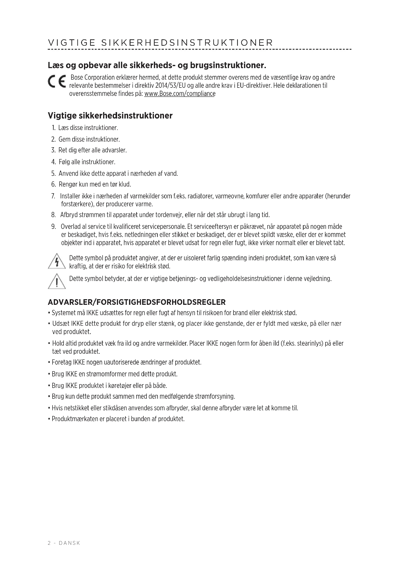 er beskadiget, hvis f.eks. netledningen eller stikket er beskadiget, der er blevet spildt væske, eller der er kommet objekter ind i apparatet, hvis apparatet er blevet udsat for regn eller fugt, ikke virker normalt eller er blevet tabt. Dette symbol på produktet angiver, at der er uisoleret farlig spænding indeni produktet, som kan være så kraftig, at der er risiko for elektrisk stød. Dette symbol betyder, at der er vigtige betjenings- og vedligeholdelsesinstruktioner i denne vejledning. ADVARSLER/FORSIGTIGHEDSFORHOLDSREGLER