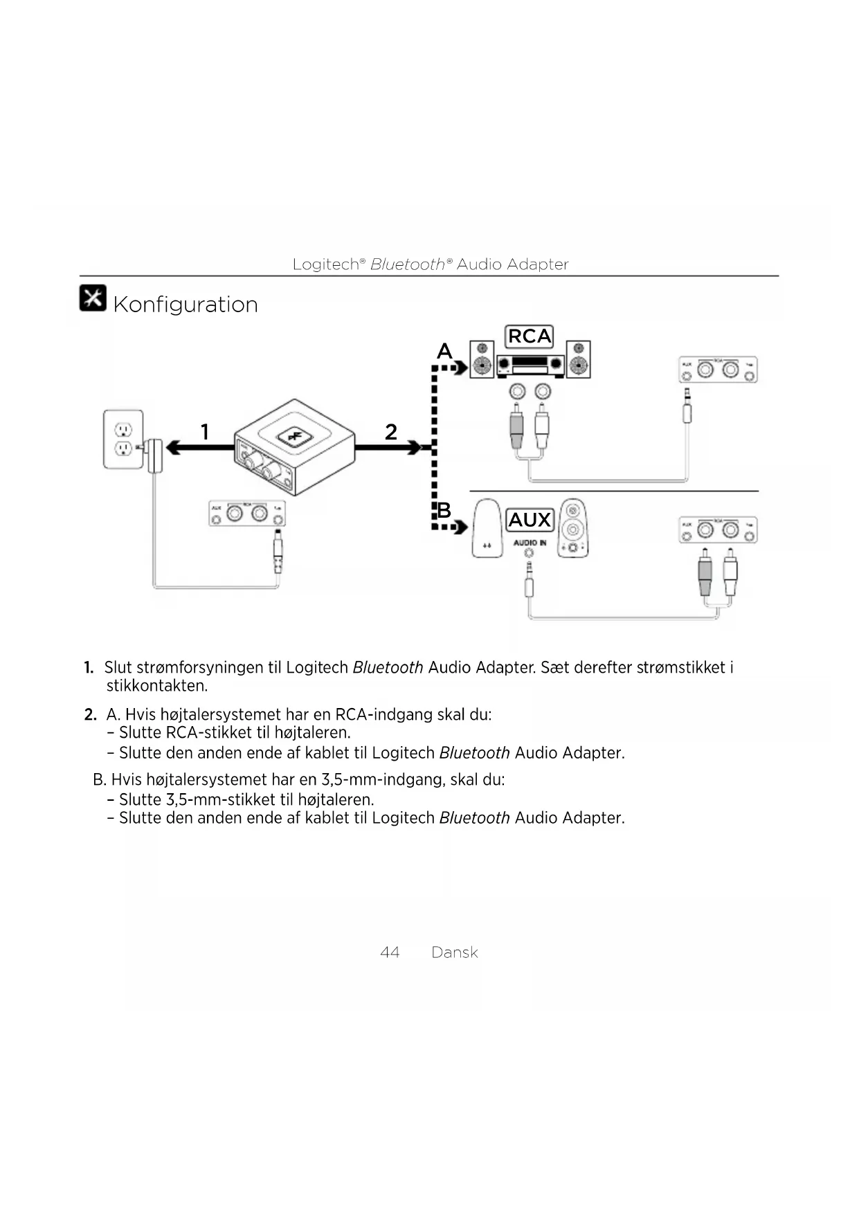 – Slutte RCA-stikket til højtaleren. – Slutte den anden ende af kablet til Logitech Bluetooth Audio Adapter. B. Hvis højtalersystemet har en 3,5-mm-indgang, skal du: – Slutte 3,5-mm-stikket til højtaleren. – Slutte den anden ende af kablet til Logitech Bluetooth Audio Adapter.Logitech® Bluetooth® Audio Adapter 45 Dansk