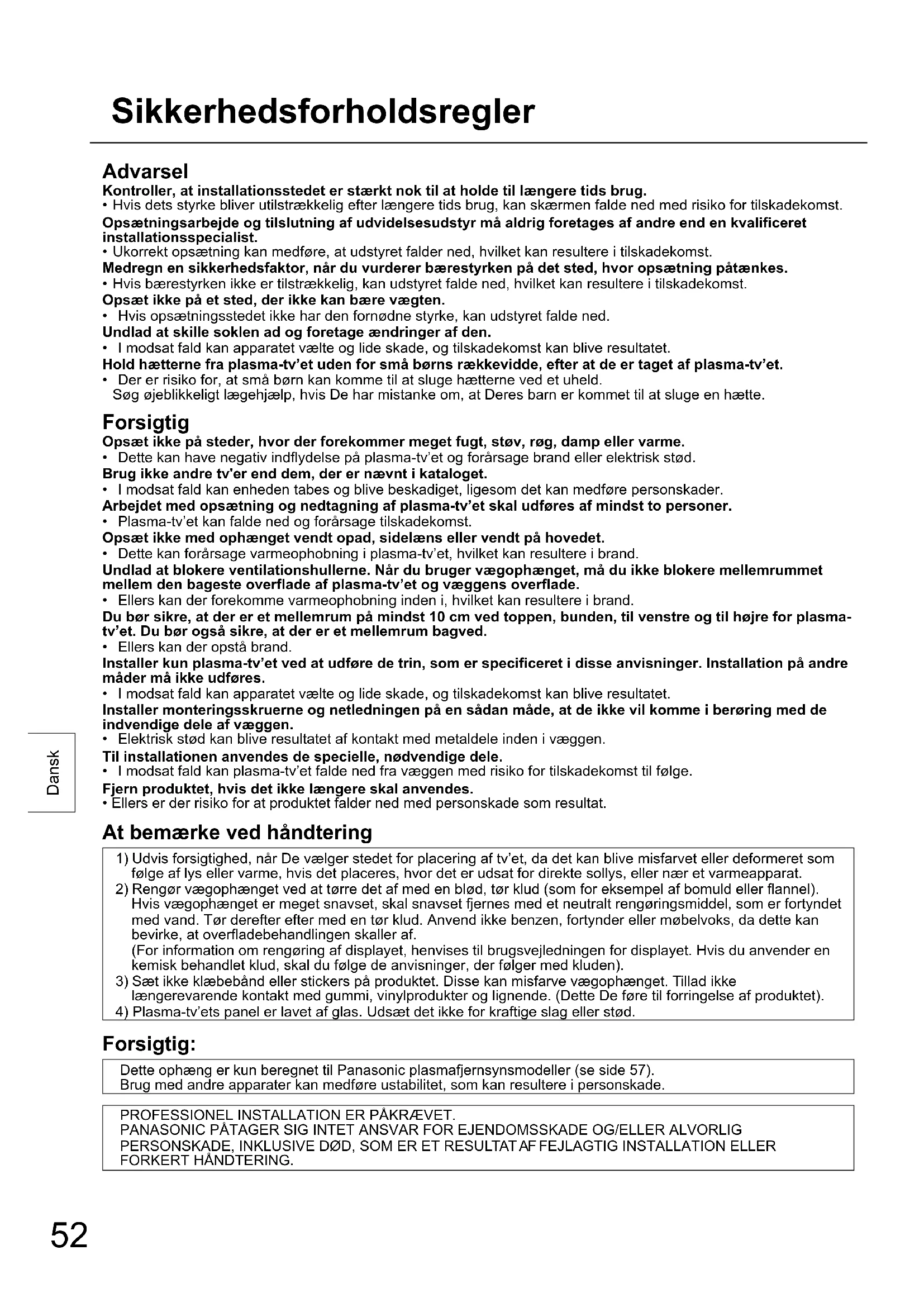 - Endast en yrkesman får ta bort plasma-TV:n från väggfästet.52 Dansk Sikkerhedsforholdsregler Advarsel Kontroller, at installationsstedet er stærkt nok til at holde til længere tids brug.
