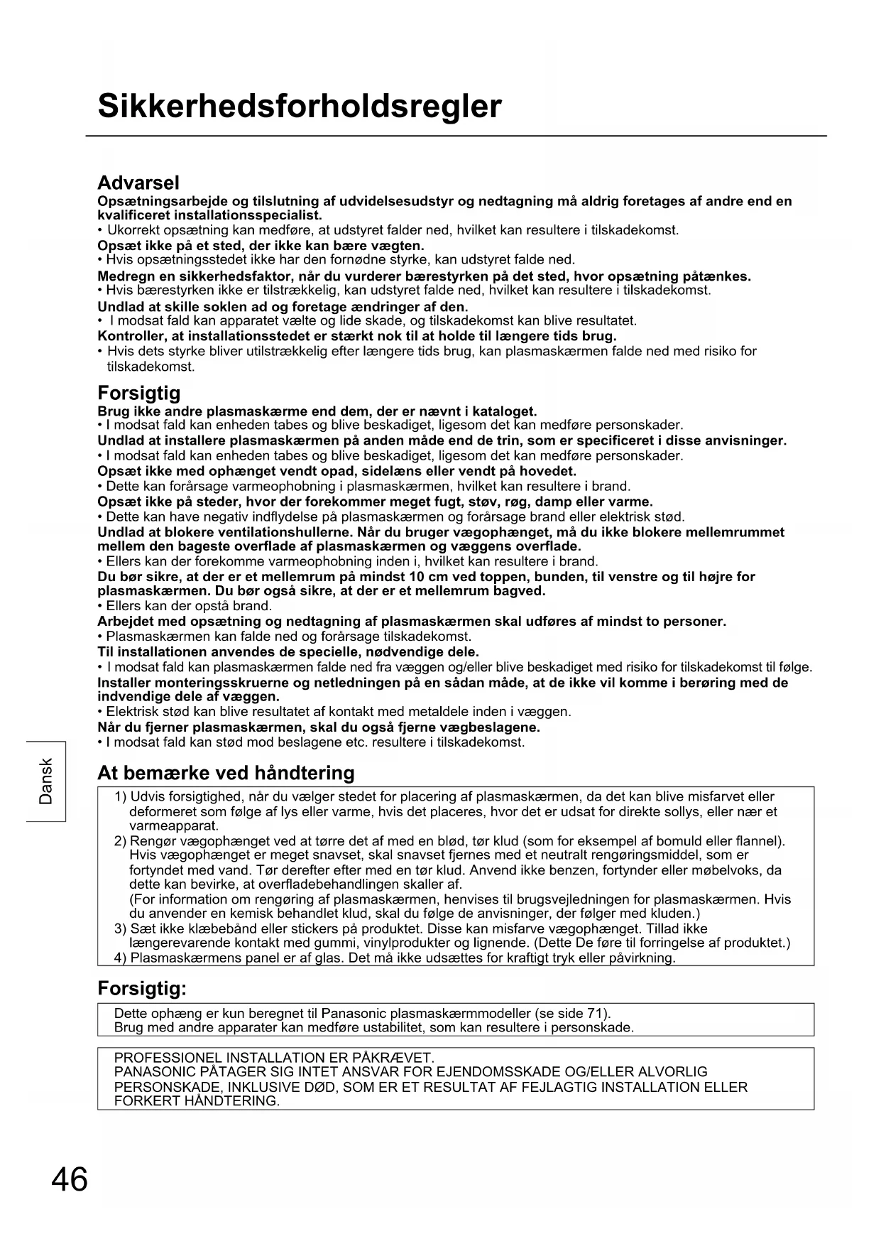 - Hvis dets styrke bliver utilstrækkelig efter længere tids brug, kan plasmaskærmen falde ned med risiko for tilskadekomst. Forsigtig Brug ikke andre plasmaskærme end dem, der er nævnt i kataloget.