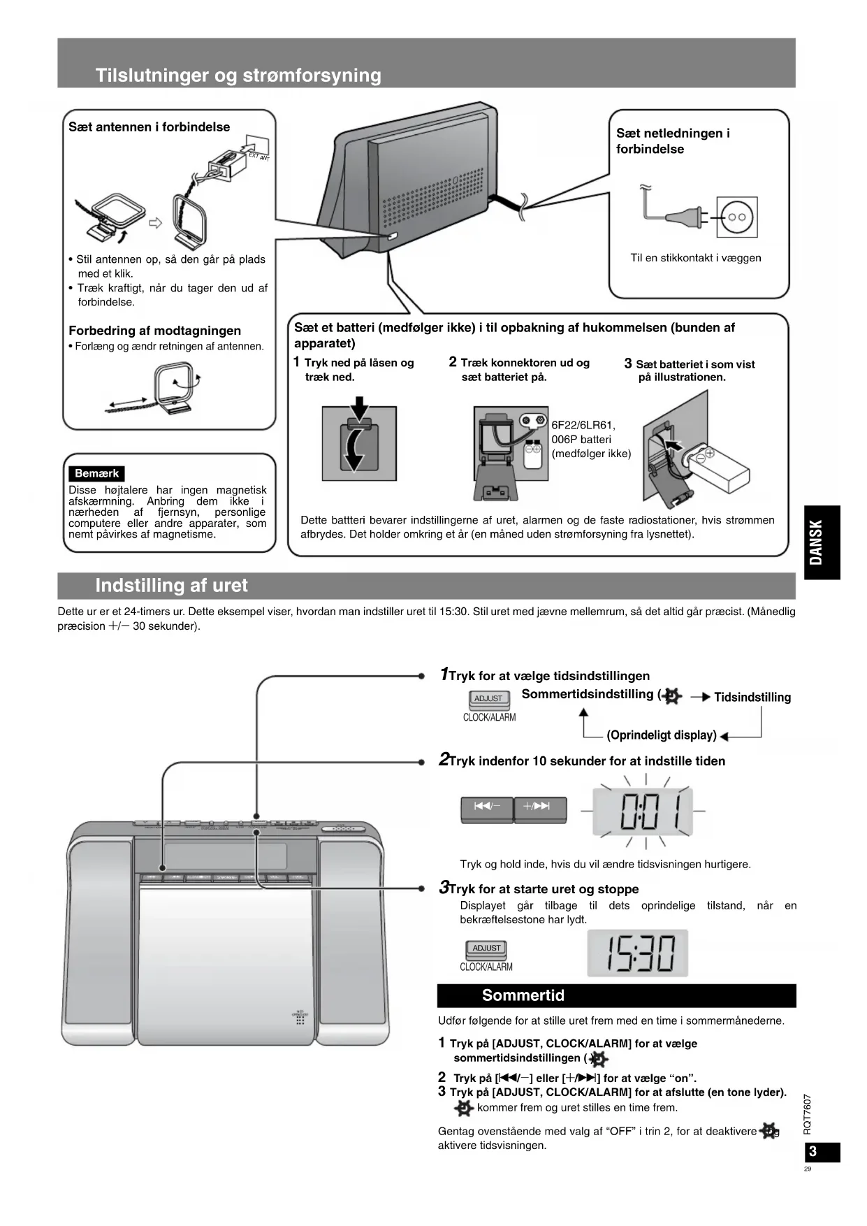 Dette ur er et 24-timers ur. Dette eksempel viser, hvordan man indstiller uret til 15:30. Stil uret med jævne mellemrum, så det altid går præcist. (Månedlig præcision 4/3 30 sekunder). 1 Tryk for at vælge tidsindstillingen 2 Tryk indenfor 10 sekunder for at indstille tiden Tryk og hold inde, hvis du vil ændre tidsvisningen hurtigere. 3 Tryk for at starte uret og stoppe Displayet går tilbage til dets oprindelige tilstand, når en bekræftelsestone har lydt. Udfør følgende for at stille uret frem med en time i sommermånederne. 1 Tryk på [ADJUST, CLOCK/ALARM] for at vælge sommertidsindstillingen ( ). 2 Tryk på [u/3] eller [4/i] for at vælge “on”. 3 Tryk på [ADJUST, CLOCK/ALARM] for at afslutte (en tone lyder). kommer frem og uret stilles en time frem. Gentag ovenstående med valg af “OFF” i trin 2, for at deaktivere og aktivere tidsvisningen. Tilslutninger og strømforsyning Indstilling af uret EXT