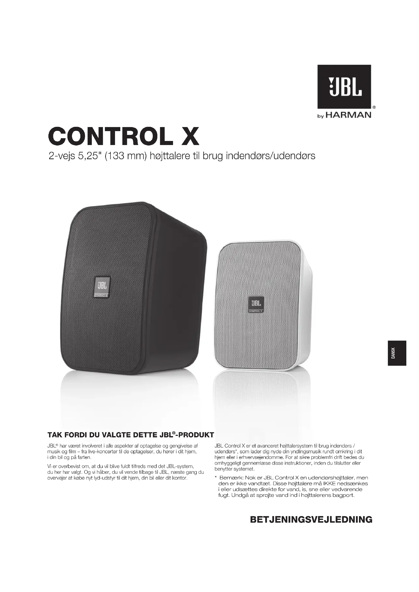 har været involveret i alle aspekter af optagelse og gengivelse af musik og lm – fra live-koncerter til de optagelser, du hører i dit hjem, i din bil og på farten. Vi er overbevist om, at du vil blive fuldt tilfreds med det JBL-system, du her har valgt. Og vi håber, du vil vende tilbage til JBL, næste gang du overvejer at købe nyt lyd-udstyr til dit hjem, din bil eller dit kontor. JBL Control X er et avanceret højttalersystem til brug indendørs / udendørs*, som lader dig nyde din yndlingsmusik rundt omkring i dit hjem eller i erhvervsejendomme. For at sikre problemfri drift bedes du omhyggeligt gennemlæse disse instruktioner, inden du tilslutter eller benytter systemet.