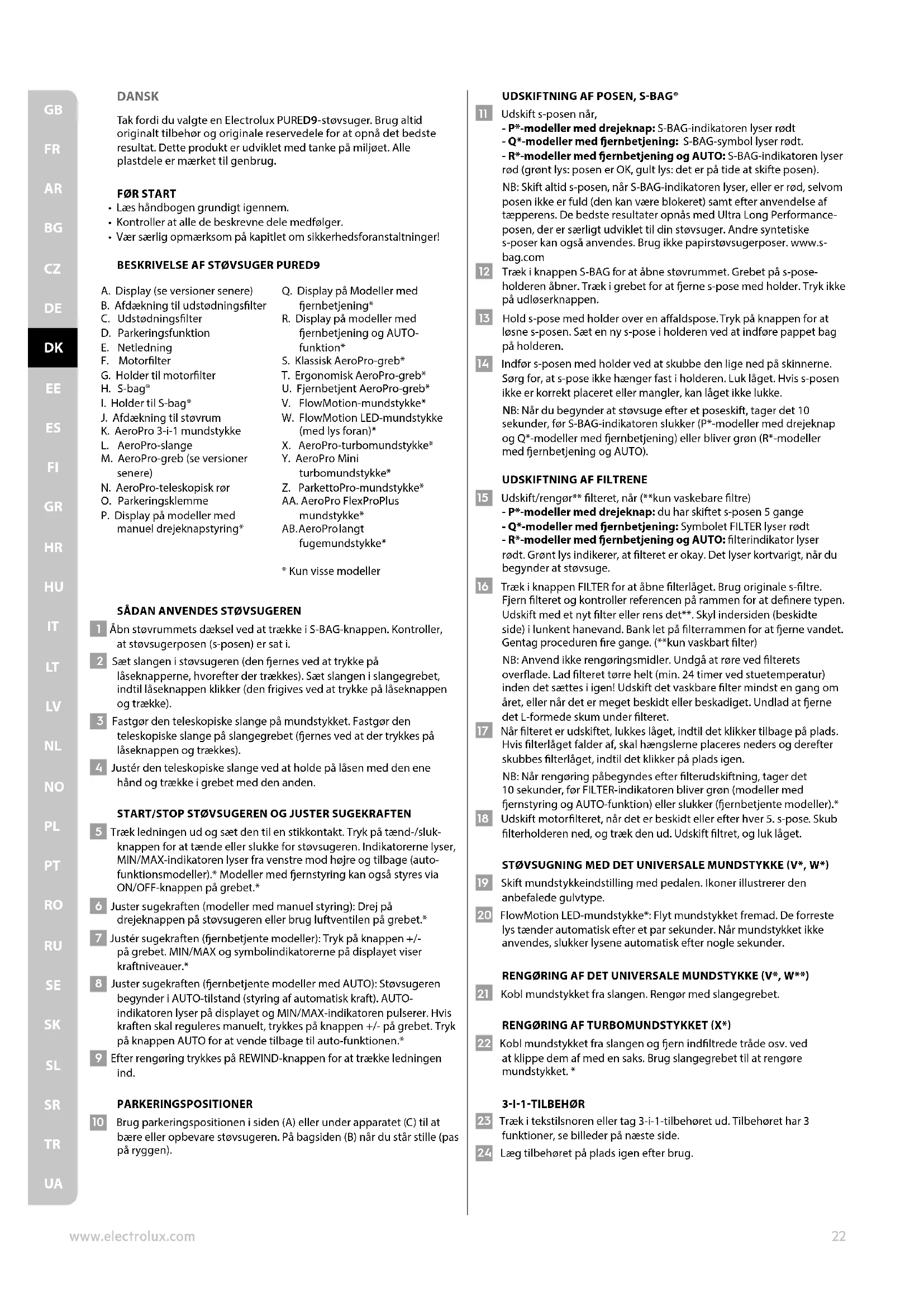 UADANSK Tak fordi du valgte en Electrolux PURED9-støvsuger. Brug altid originalt tilbehør og originale reservedele for at opnå det bedste resultat. Dette produkt er udviklet med tanke på miljøet. Alle plastdele er mærket til genbrug.