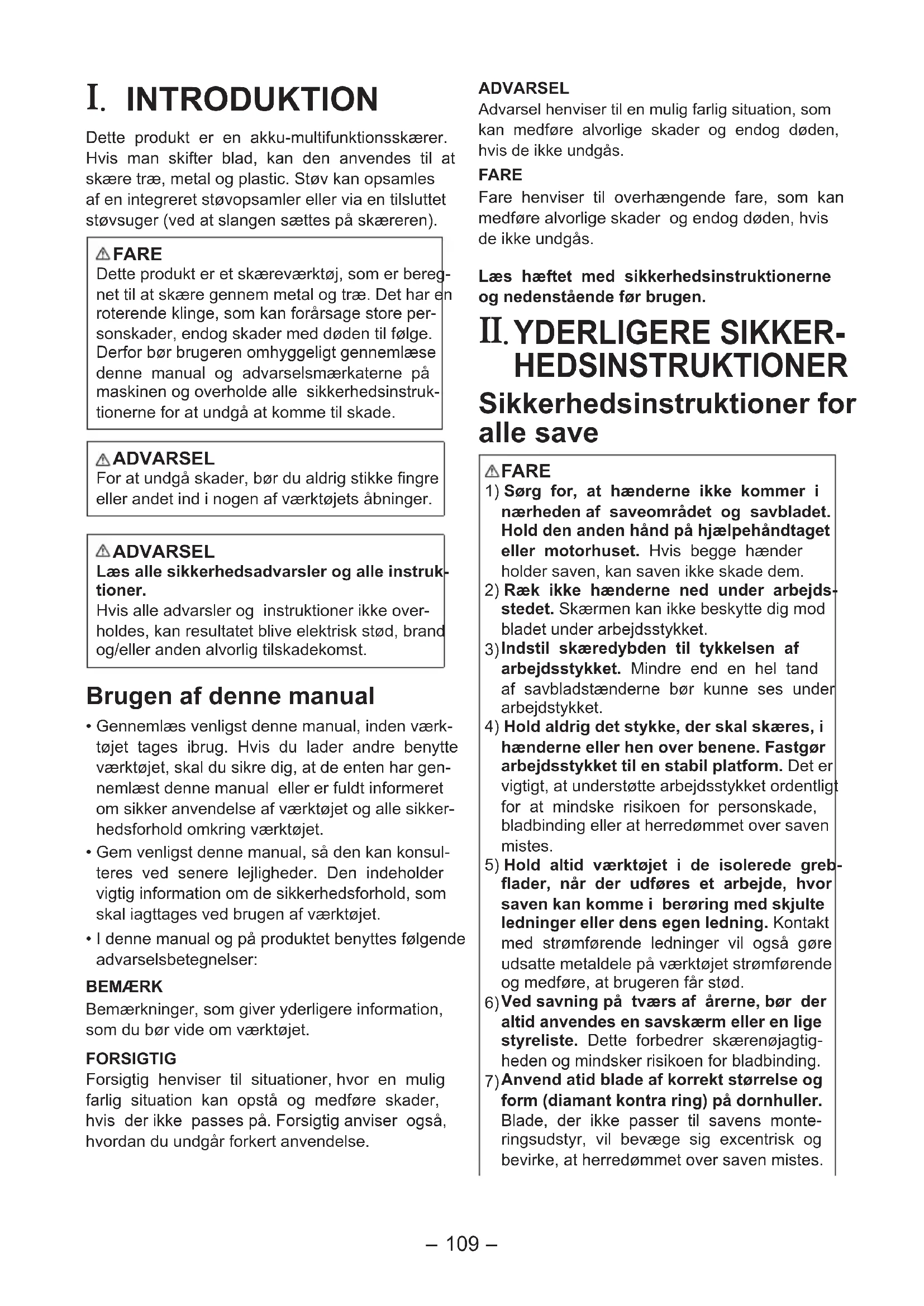 . INTRODUKTION Dette produkt er en akku-multifunktionsskærer. Hvis man skifter blad, kan den anvendes til at skære træ, metal og plastic. Støv kan opsamles af en integreret støvopsamler eller via en tilsluttet støvsuger (ved at slangen sættes på skæreren). FARE Dette produkt er et skæreværktøj, som er bereg-net til at skære gennem metal og træ. Det har en roterende klinge, som kan forårsage store per-sonskader, endog skader med døden til følge. Derfor bør brugeren omhyggeligt gennemlæse denne manual og advarselsmærkaterne på maskinen og overholde alle sikkerhedsinstruk-tionerne for at undgå at komme til skade.ADVARSELFor at undgå skader, bør du aldrig stikke fingre eller andet ind i nogen af værktøjets åbninger.ADVARSELLæs alle sikkerhedsadvarsler og alle instruk-tioner.Hvis alle advarsler og instruktioner ikke over-holdes, kan resultatet blive elektrisk stød, brand og/eller anden alvorlig tilskadekomst. Brugen af denne manual