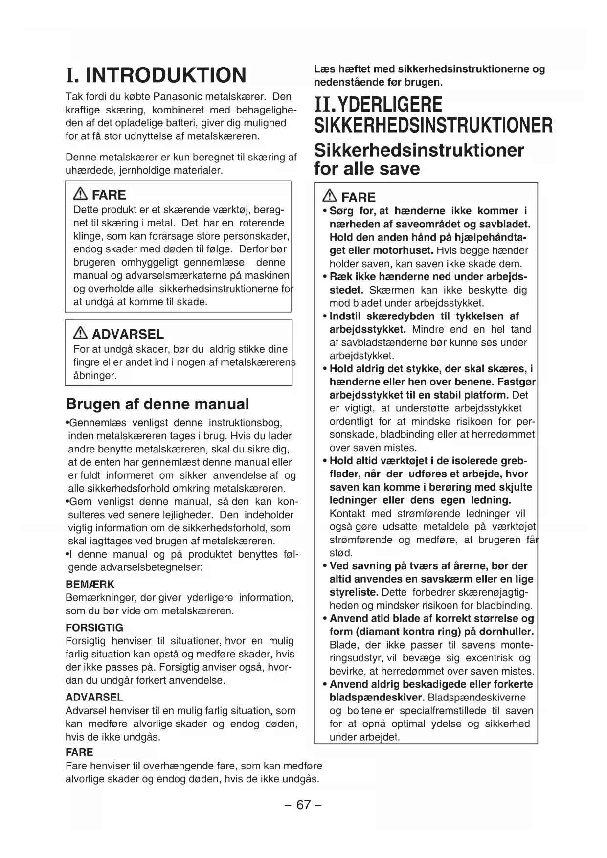 - Gennemlæs venligst denne instruktionsbog, inden metalskæreren tages i brug. Hvis du lader andre benytte metalskæreren, skal du sikre dig, at de enten har gennemlæst denne manual eller er fuldt informeret om sikker anvendelse af og alle sikkerhedsforhold omkring metalskæreren.•Gem venligst denne manual, så den kan kon-sulteres ved senere lejligheder. Den indeholder vigtig information om de sikkerhedsforhold, som skal iagttages ved brugen af metalskæreren.•I denne manual og på produktet benyttes føl-gende advarselsbetegnelser:BEMÆRKBemærkninger, der giver yderligere information, som du bør vide om metalskæreren.FORSIGTIGForsigtig henviser til situationer, hvor en mulig farlig situation kan opstå og medføre skader, hvis der ikke passes på. Forsigtig anviser også, hvor-dan du undgår forkert anvendelse.ADVARSELAdvarsel henviser til en mulig farlig situation, som kan medføre alvorlige skader og endog døden, hvis de ikke undgås. FARE Fare henviser til overhængende fare, som kan medføre alvorlige skader og endog døden, hvis de ikke undgås.Læs hæftet med sikkerhedsinstruktionerne og nedenstående før brugen. II. YDERLIGERE SIKKERHEDSINSTRUKTIONER Sikkerhedsinstruktioner for alle save FARE