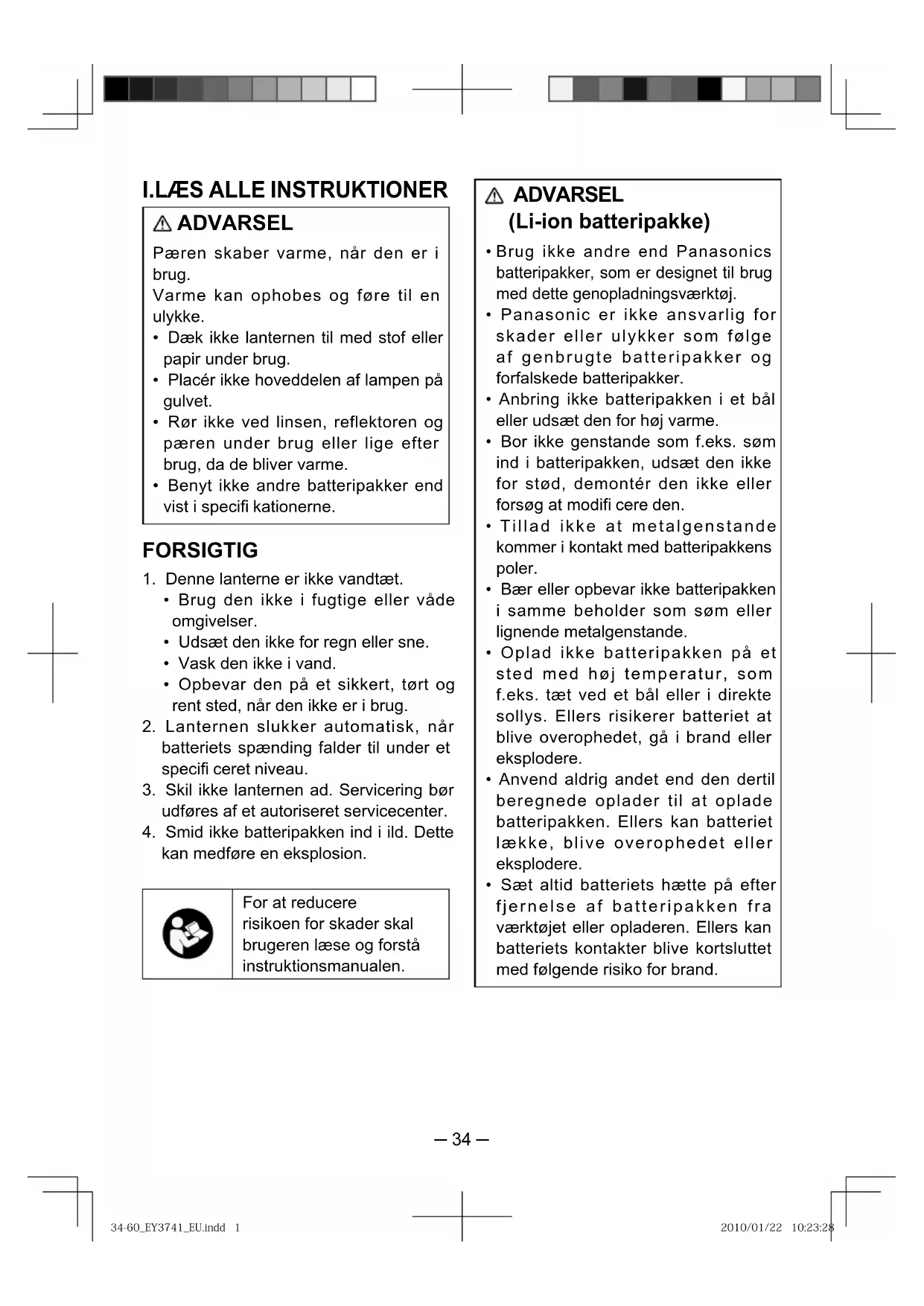 kan medføre en eksplosion. For at reducere risikoen for skader skal brugeren læse og forstå instruktionsmanualen. ADVARSEL (Li-ion batteripakke)