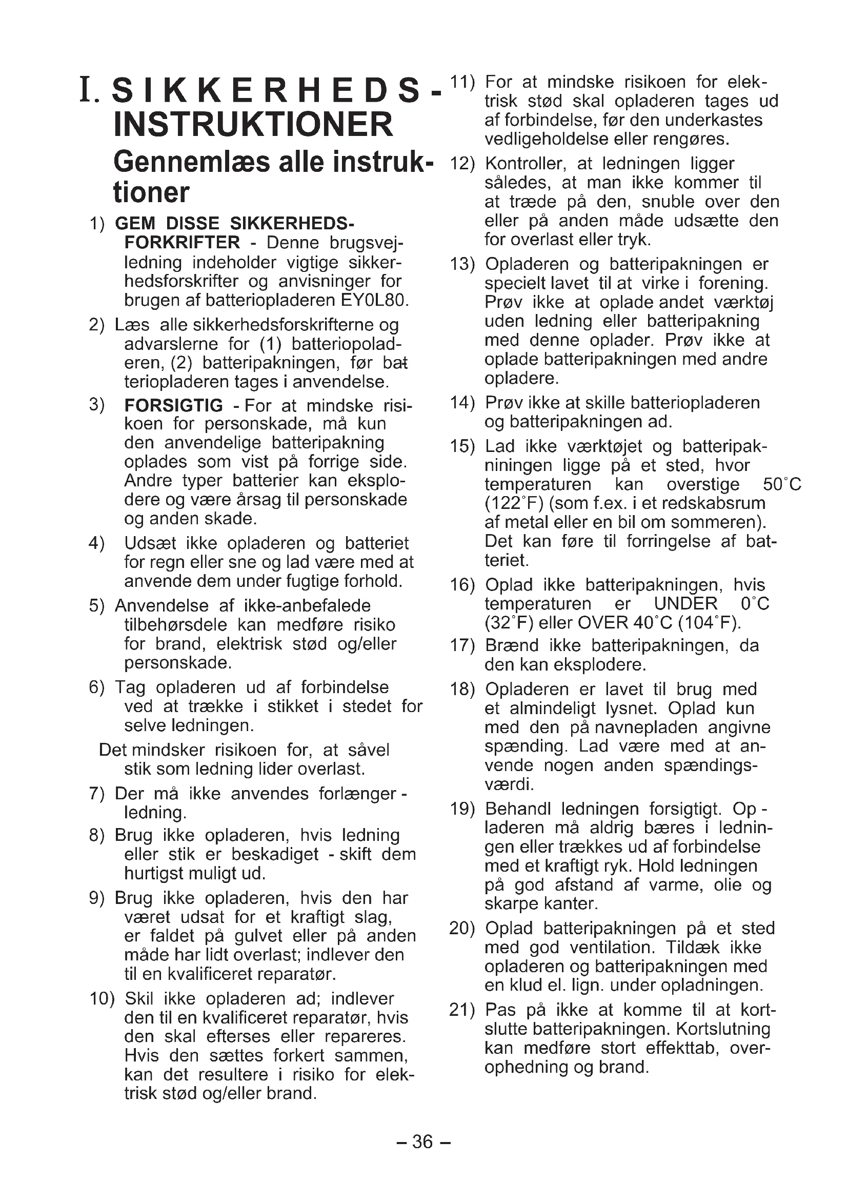 FORKRIFTER - Denne brugsvej- ledning indeholder vigtige sikker- hedsforskrifter og anvisninger for brugen af batteriopladeren EY0L80.