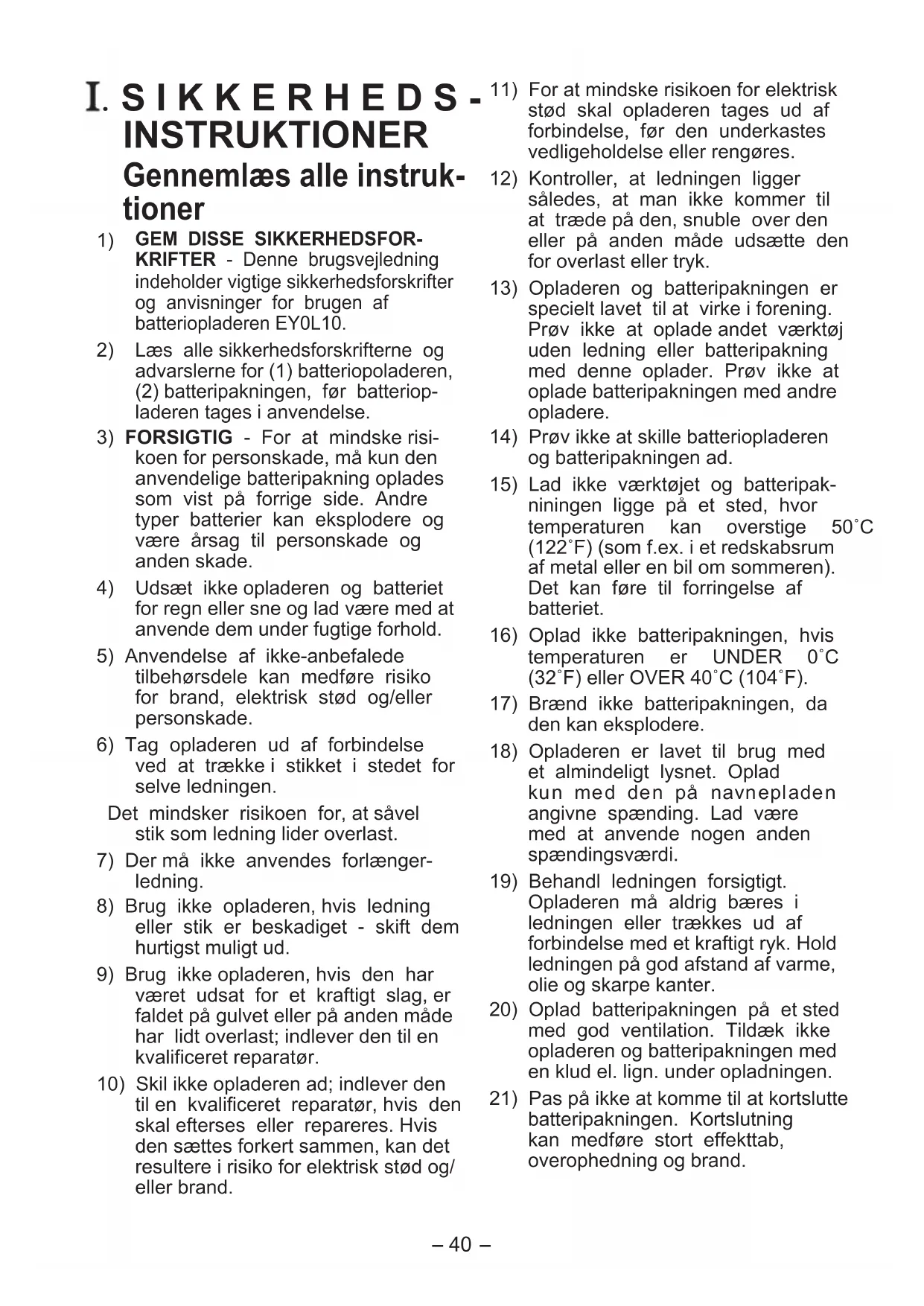 For kommercielle brugere i Den Europæiske Union Når du ønsker at kassere elektriske eller elektroniske apparater, bedes du henvende dig til din forhandler eller leverandør for nærmere information. [Information om bortskaffelse i lande uden for Den Europæiske Union] Disse symboler gælder kun inden for Den Europæiske Union. Ønsker du at kassere sådanne produkter, bedes du forhøre dig hos din forhandler eller kommune med henblik på en hensigtsmæssig bortskaffelse. Information om batterisymbol (to eksempler nedenfor): Dette symbol kan optræde sammen med et kemisk symbol. I så fald opfylder det kravene for det direktiv, som er blevet fastlagt for det pågældende kemikalie. III . TEKNISKE SPECIFIKATIONER Model EY0L10Mærkedata Se mærkepladen på undersiden af opladeren.Vægt 0,6 kg (1,3 lbs) [Li-ion batteripakning] OpladningstidSpænding3,6 V DC (3,6 V × 1 celler)1,5 AhEY9L10Brugbar: 15 min.Fuld: 30 min. [Ni-Cd batteripakning] OpladningstidSpænding2,4 V 3,6 V1,2 AhEY902115 min.EY902515 min. BEMÆRK: Denne oversigt kan inkludere modeller, der ikke fås i dit område. Se venligst det nyeste, almindelige katalog.-