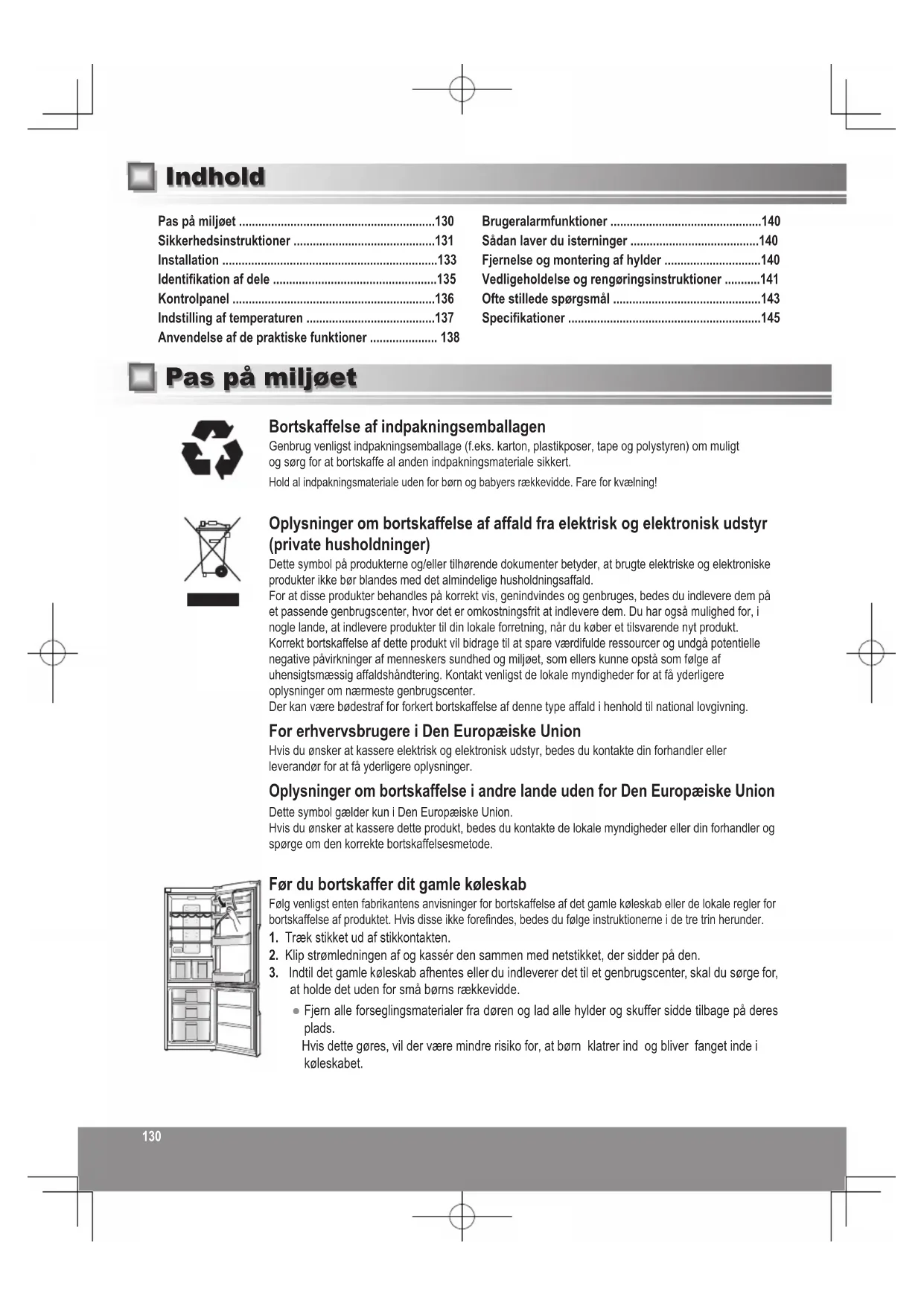 Strømforbruk per år er basert på resultater av standardtester for 24 timer. Det faktiske strømforbruket kan variere avhengig av hvordan apparatet brukes, og hvor det er plassert. Når dørene er helt åpne 299 mm 120 º 1095 mm130130 Bortskaffelse af indpakningsemballagen Genbrug venligst indpakningsemballage (f.eks. karton, plastikposer, tape og polystyren) om muligt og sørg for at bortskaffe al anden indpakningsmateriale sikkert. Hold al indpakningsmateriale uden for børn og babyers rækkevidde. Fare for kvælning! Oplysninger om bortskaffelse af affald fra elektrisk og elektronisk udstyr (private husholdninger) Dette symbol på produkterne og/eller tilhørende dokumenter betyder, at brugte elektriske og elektroniske produkter ikke bør blandes med det almindelige husholdningsaffald. For at disse produkter behandles på korrekt vis, genindvindes og genbruges, bedes du indlevere dem på et passende genbrugscenter, hvor det er omkostningsfrit at indlevere dem. Du har også mulighed for, i nogle lande, at indlevere produkter til din lokale forretning, når du køber et tilsvarende nyt produkt. Korrekt bortskaffelse af dette produkt vil bidrage til at spare værdifulde ressourcer og undgå potentielle negative påvirkninger af menneskers sundhed og miljøet, som ellers kunne opstå som følge af uhensigtsmæssig affaldshåndtering. Kontakt venligst de lokale myndigheder for at få yderligere oplysninger om nærmeste genbrugscenter. Der kan være bødestraf for forkert bortskaffelse af denne type affald i henhold til national lovgivning. For erhvervsbrugere i Den Europæiske Union Hvis du ønsker at kassere elektrisk og elektronisk udstyr, bedes du kontakte din forhandler eller leverandør for at få yderligere oplysninger. Oplysninger om bortskaffelse i andre lande uden for Den Europæiske Union Dette symbol gælder kun i Den Europæiske Union. Hvis du ønsker at kassere dette produkt, bedes du kontakte de lokale myndigheder eller din forhandler og spørge om den korrekte bortskaffelsesmetode. Før du bortskaffer dit gamle køleskab Følg venligst enten fabrikantens anvisninger for bortskaffelse af det gamle køleskab eller de lokale regler for bortskaffelse af produktet. Hvis disse ikke forendes, bedes du følge instruktionerne i de tre trin herunder.