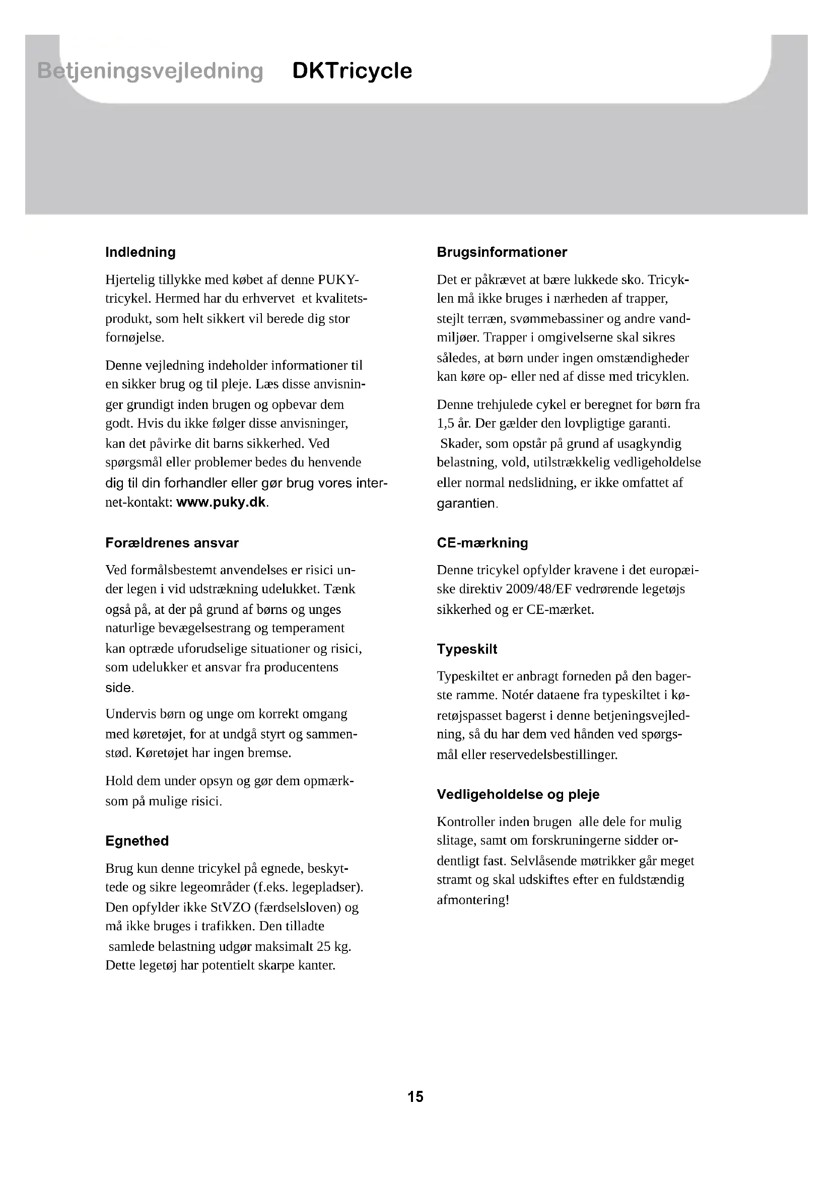 Hjertelig tillykke med kobet af donne PUKYtricykel. Hermed har du erhvervet et kvalitetsprodukt, som helt sikkert vil berede dig stor fornjelse.