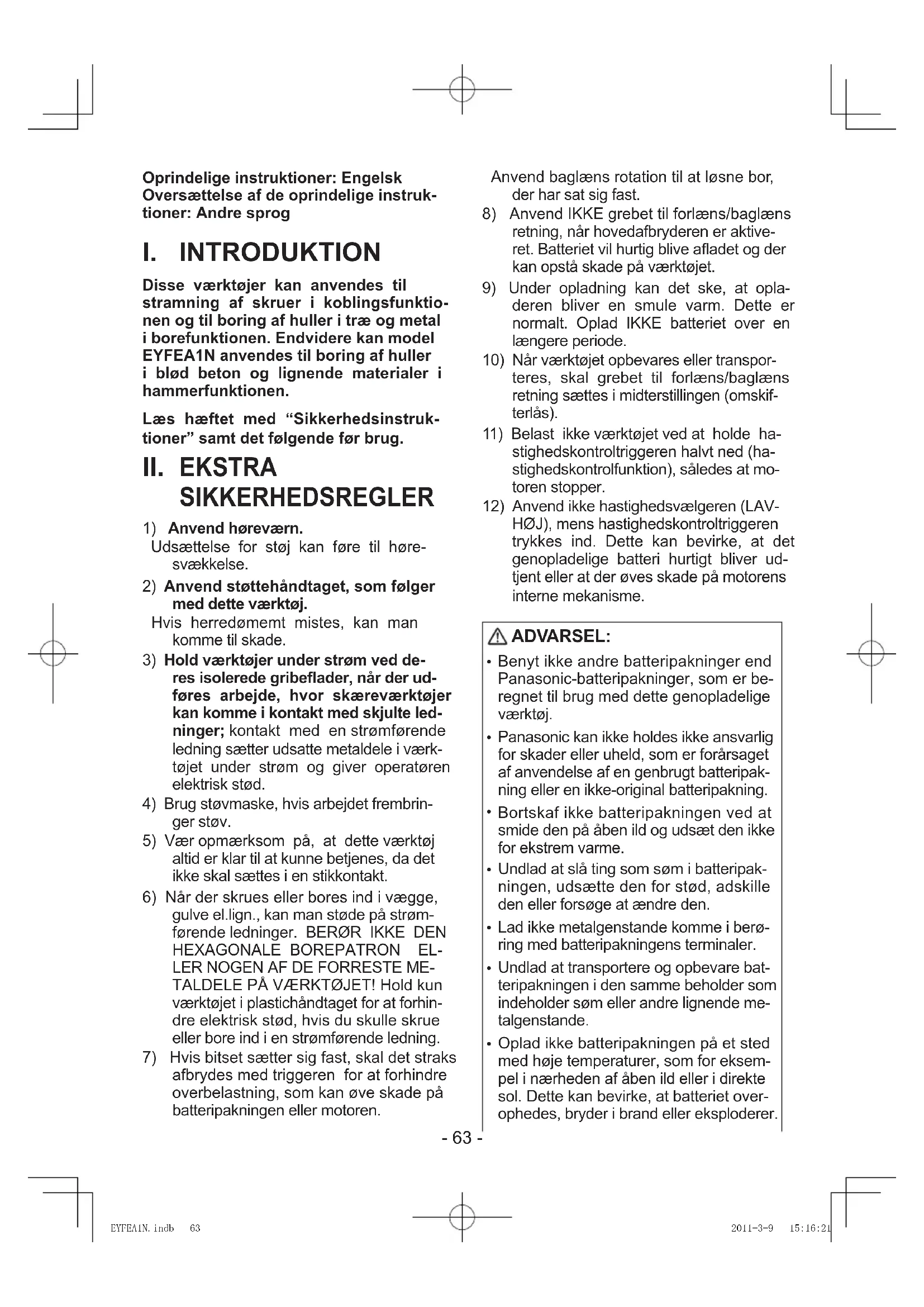Download vejledningen til din Trådløs boremaskine i PDF-format gratis! Find din vejledning EYFEA1N - PANASONIC og tag din elektroniske enhed tilbage i hånden. På denne side er alle dokumenter nødvendige for brugen af din enhed offentliggjort. EYFEA1N af mærket PANASONIC.