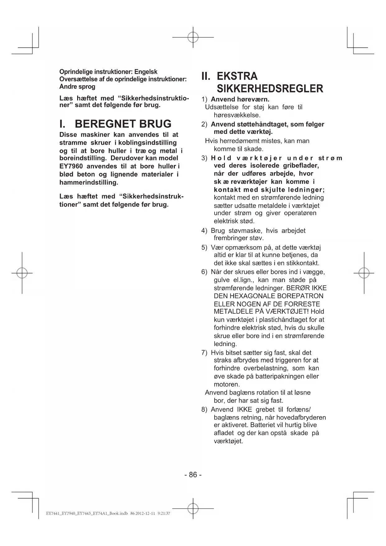 baglæns retning, når hovedafbryderen er aktiveret. Batteriet vil hurtig blive afladet og der kan opstå skade på værktøjet. Oprindelige instruktioner: Engelsk Oversættelse af de oprindelige instruktioner: Andre sprog Læs hæftet med “Sikkerhedsinstruktio- ner” samt det følgende før brug. EY7441_EY7940_EY7443_EY74A1_Book.indb 86 2012-12-11 9:21:37- 87 -