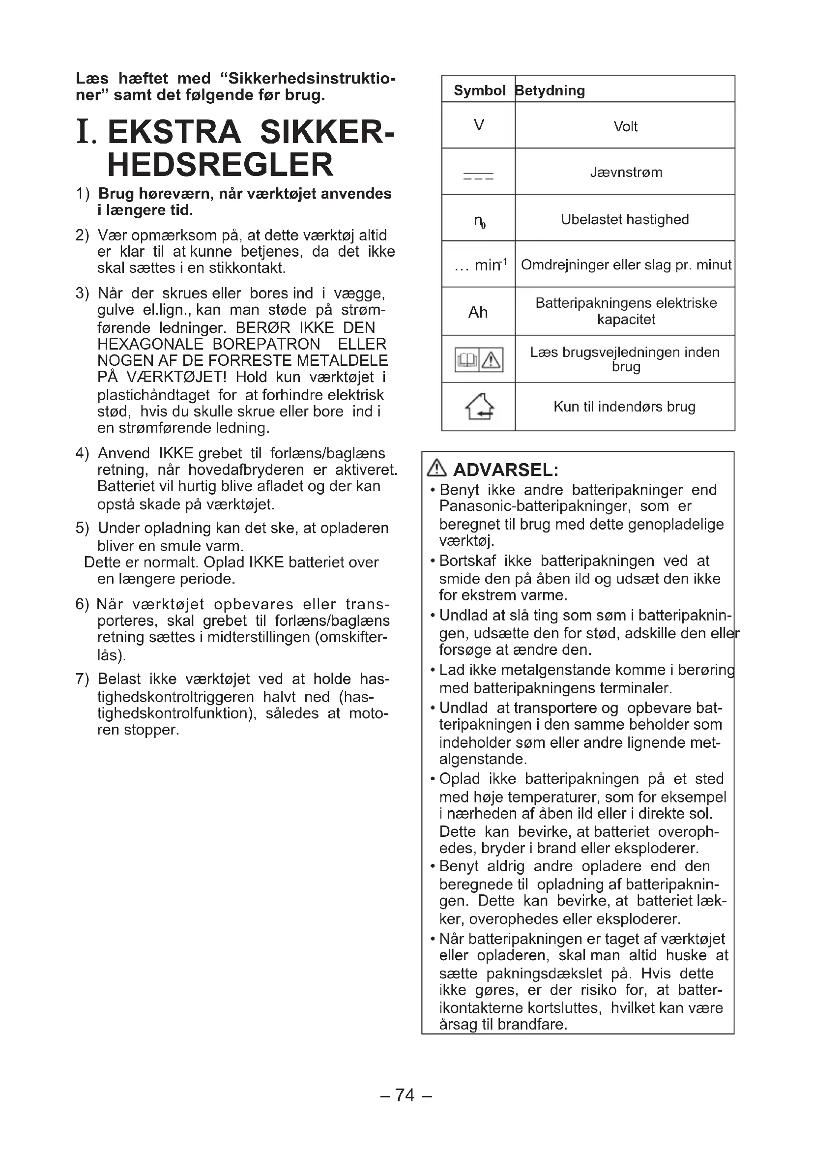 - Benyt ikke andre batteripakninger end Panasonic-batteripakninger, som er beregnet til brug med dette genopladelige værktøj. Bortskaf ikke batteripakningen ved at smide den på åben ild og udsæt den ikke for ekstrem varme. Undlad at slå ting som søm i batteripaknin-gen, udsætte den for stød, adskille den eller forsøge at ændre den. Lad ikke metalgenstande komme i berøring med batteripakningens terminaler. Undlad at transportere og opbevare bat-teripakningen i den samme beholder som indeholder søm eller andre lignende met-algenstande. Oplad ikke batteripakningen på et sted med høje temperaturer, som for eksempel i nærheden af åben ild eller i direkte sol. Dette kan bevirke, at batteriet overoph-edes, bryder i brand eller eksploderer. Benyt aldrig andre opladere end den beregnede til opladning af batteripaknin-gen. Dette kan bevirke, at batteriet læk-ker, overophedes eller eksploderer. Når batteripakningen er taget af værktøjet eller opladeren, skal man altid huske at sætte pakningsdækslet på. Hvis dette ikke gøres, er der risiko for, at batter-ikontakterne kortsluttes, hvilket kan være årsag til brandfare.-