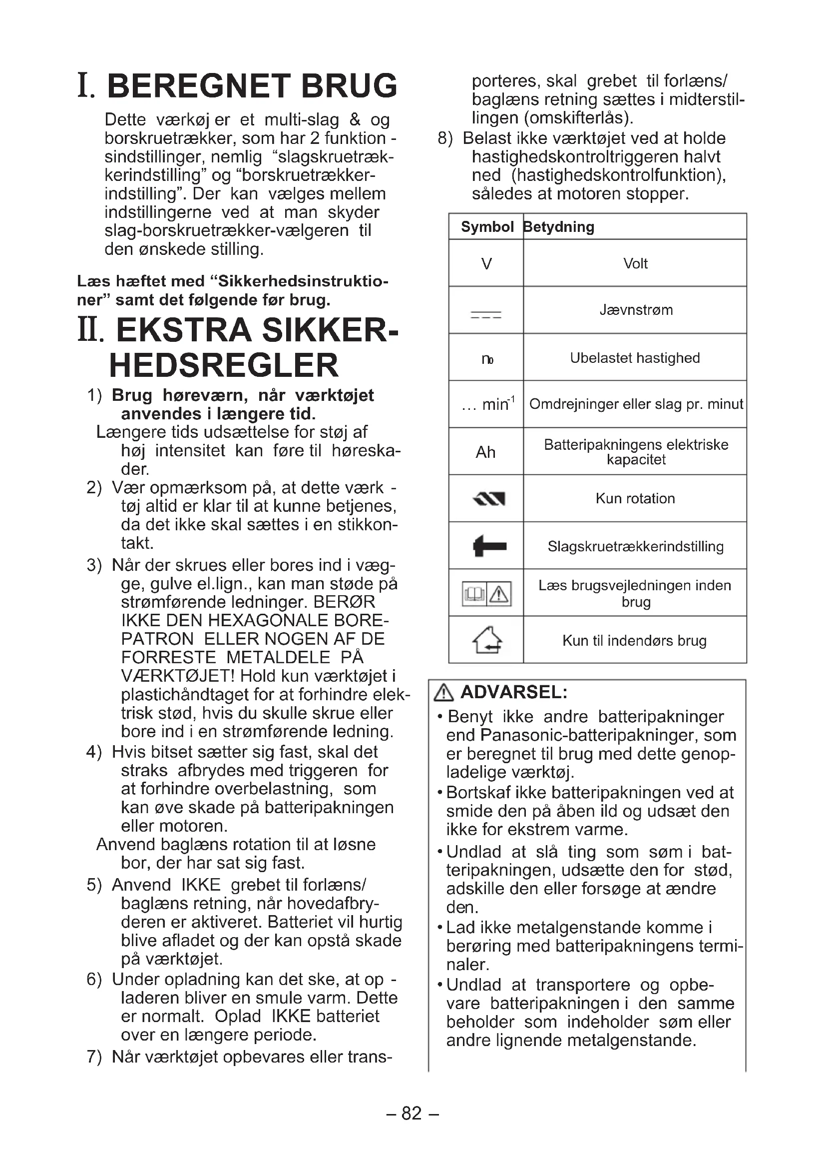 Dette værktøj ma ikke anvendes som et bor i "slagskruetrækkerindstilling". Under boring i stål kan bitset brække, hvis det blokeres, hvilket kan fore til farlige snitsår.
