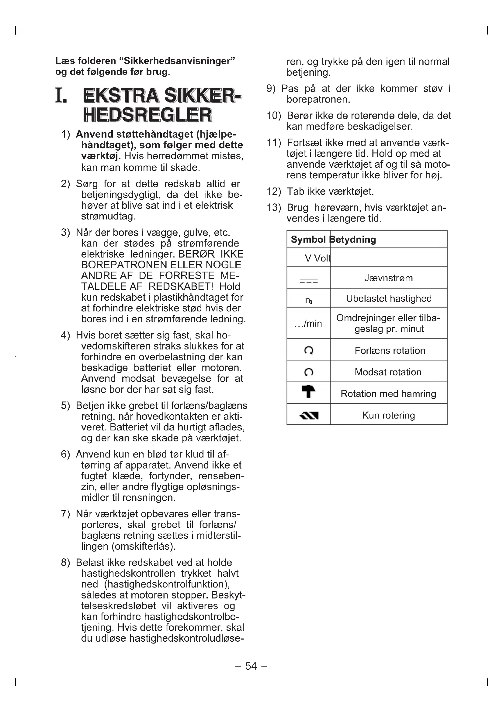3) När der bores i vægge, gulve, etc. kan der stodes på strømførende elektriske ledninger. BERØR IKKE BOREPATRONEN ELLER NOGLE ANDRE AF DE FORRESTE METALDELE AF REDSKABET! Hold kun redskabet i plastikhandtaget for at forbindre elektriske stød hvis der bores ind i en strømførende ledning.