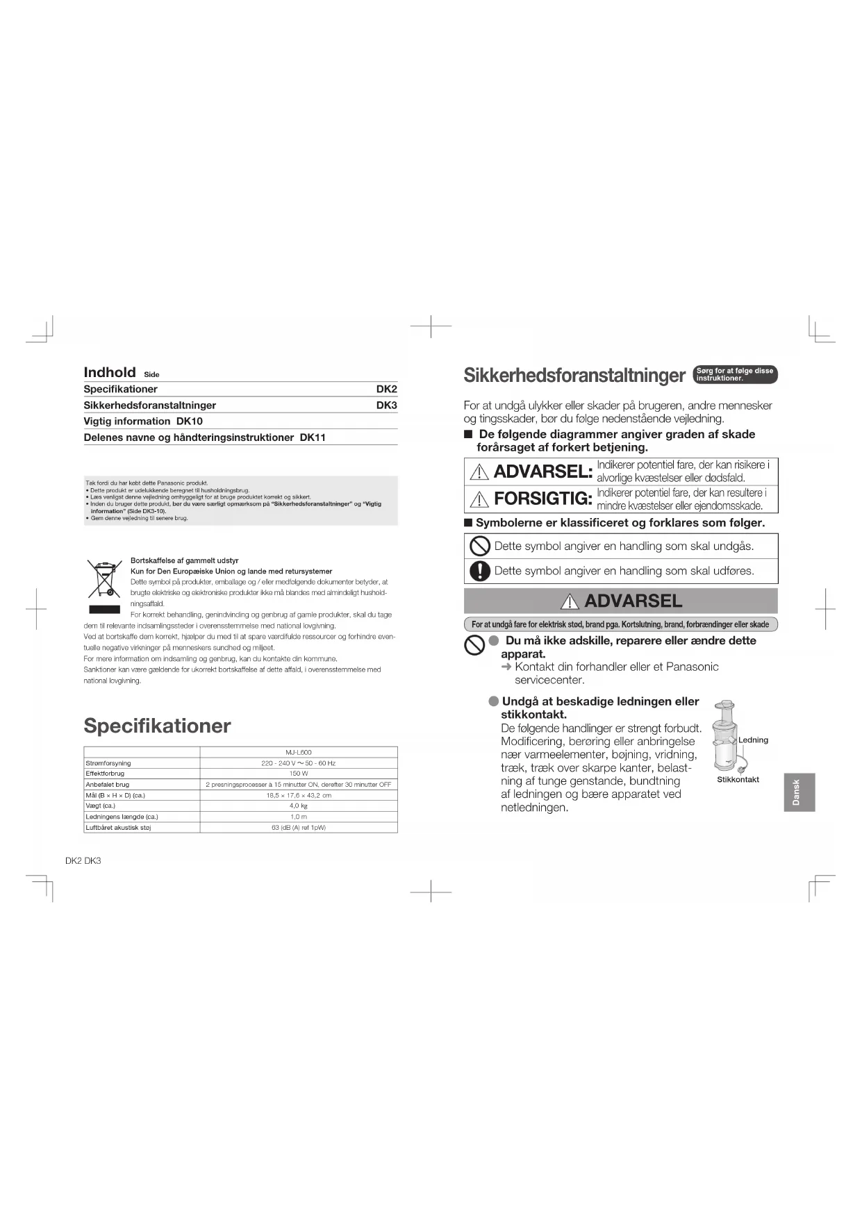 Download vejledningen til din Juicemaskine i PDF-format gratis! Find din vejledning MJL600 - PANASONIC og tag din elektroniske enhed tilbage i hånden. På denne side er alle dokumenter nødvendige for brugen af din enhed offentliggjort. MJL600 af mærket PANASONIC.