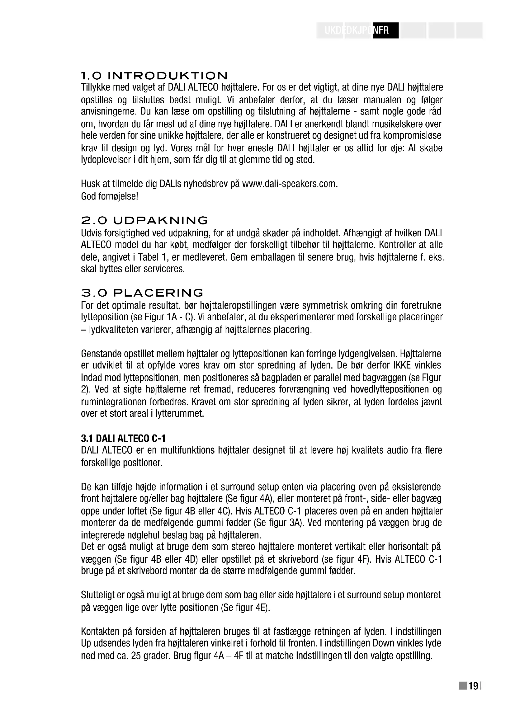 DALI ALTECO er en multifunktions højttaler designet til at levere høj kvalitets audio fra flere forskellige positioner. De kan tilføje højde information i et surround setup enten via placering oven på eksisterende front højttalere og/eller bag højttalere (Se figur 4A), eller monteret på front-, side- eller bagvæg oppe under loftet (Se figur 4B eller 4C). Hvis ALTECO C-1 placeres oven på en anden højttaler monterer da de medfølgende gummi fødder (Se figur 3A). Ved montering på væggen brug de integrerede nøglehul beslag bag på højttaleren. Det er også muligt at bruge dem som stereo højttalere monteret vertikalt eller horisontalt på væggen (Se figur 4B eller 4D) eller opstillet på et skrivebord (se figur 4F). Hvis ALTECO C-1 bruge på et skrivebord monter da de større medfølgende gummi fødder. Slutteligt er også muligt at bruge dem som bag eller side højttalere i et surround setup monteret på væggen lige over lytte positionen (Se figur 4E). Kontakten på forsiden af højttaleren bruges til at fastlægge retningen af lyden. I indstillingen Up udsendes lyden fra højttaleren vinkelret i forhold til fronten. I indstillingen Down vinkles lyde ned med ca. 25 grader. Brug figur 4A – 4F til at matche indstillingen til den valgte opstilling.20