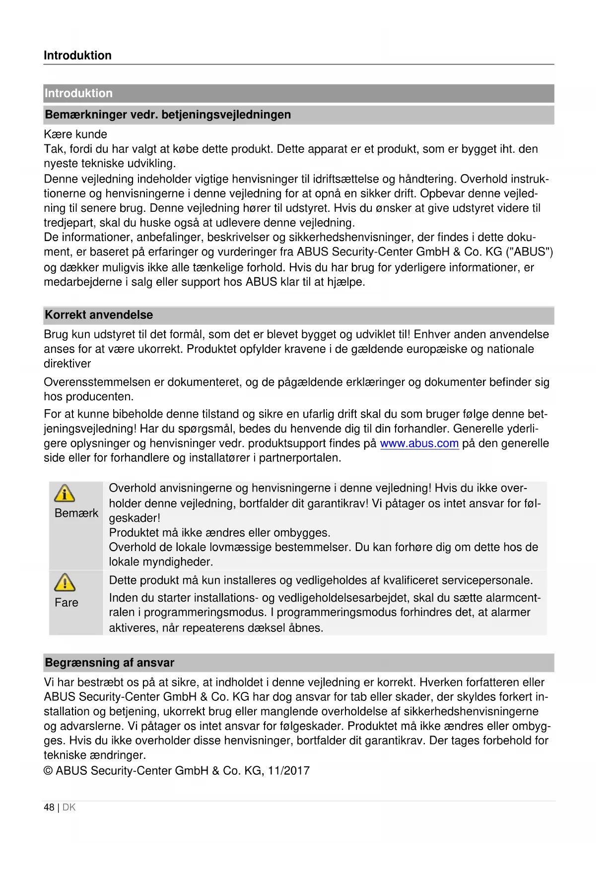 Begrænsning af ansvar Vi har bestræbt os på at sikre, at indholdet i denne vejledning er korrekt. Hverken forfatteren eller ABUS Security-Center GmbH & Co. KG har dog ansvar for tab eller skader, der skyldes forkert in- stallation og betjening, ukorrekt brug eller manglende overholdelse af sikkerhedshenvisningerne og advarslerne. Vi påtager os intet ansvar for følgeskader. Produktet må ikke ændres eller ombyg- ges. Hvis du ikke overholder disse henvisninger, bortfalder dit garantikrav. Der tages forbehold for tekniske ændringer. © ABUS Security-Center GmbH & Co. KG, 11/2017Sikkerhedsanvisninger