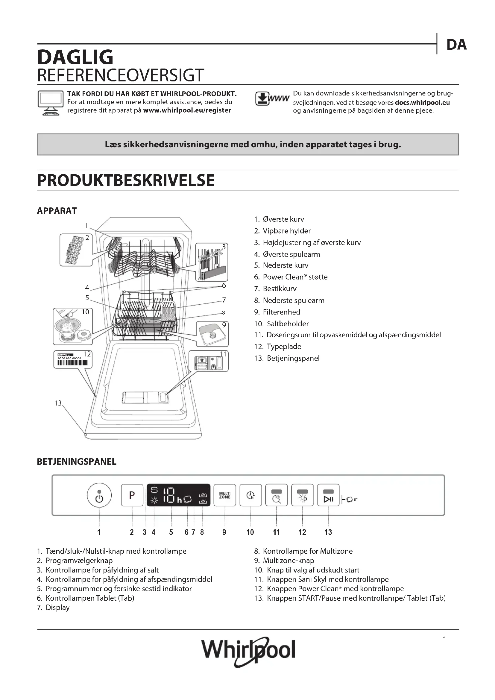 DAGLIG REFERENCEOVERSIGT TAK FORDI DU HAR KØBT ET WHIRLPOOL-PRODUKT.For at modtage en mere komplet assistance, bedes du registrere dit apparat på www.whirlpool.eu/registerLæs sikkerhedsanvisningerne med omhu, inden apparatet tages i brug. PRODUKTBESKRIVELSE APPARATBETJENINGSPANELDu kan downloade sikkerhedsanvisningerne og brug-svejledningen, ved at besøge vores docs.whirlpool.eu og anvisningerne på bagsiden af denne pjece. 1. Tænd/sluk-/Nulstil-knap med kontrollampe2. Programvælgerknap3. Kontrollampe for påfyldning af salt4. Kontrollampe for påfyldning af afspændingsmiddel5. Programnummer og forsinkelsestid indikator6. Kontrollampen Tablet (Tab) 7. Display8. Kontrollampe for Multizone9. Multizone-knap10. Knap til valg af udskudt start11. Knappen Sani Skyl med kontrollampe12. Knappen Power Clean® med kontrollampe13. Knappen START/Pause med kontrollampe/ Tablet (Tab)1. Øverste kurv2. Vipbare hylder3. Højdejustering af øverste kurv4. Øverste spulearm5. Nederste kurv6. Power Clean® støtte7. Bestikkurv8. Nederste spulearm9. Filterenhed10. Saltbeholder11. Doseringsrum til opvaskemiddel og afspændingsmiddel12. Typeplade13. Betjeningspanel