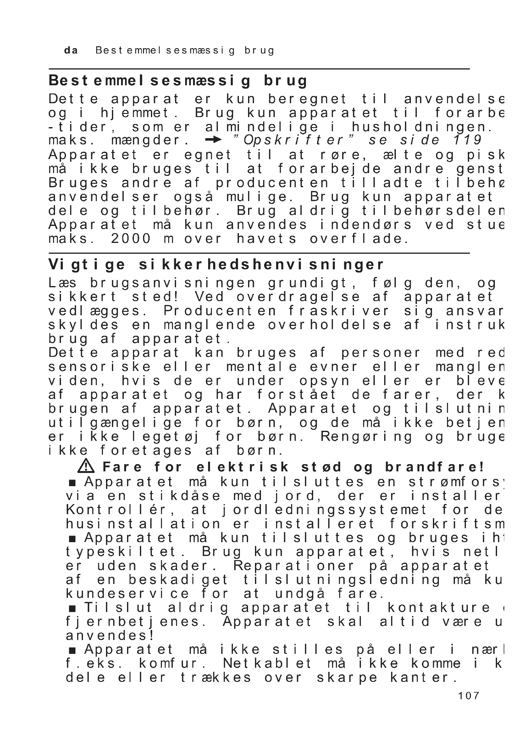 - verschijnt. Display-indicatie Mogelijke oorzaak Oplossing FOUT MOTOR OVERBELAST Er werd een te grote hoeveelheid ingredi- enten gelijktijdig of te lang verwerkt. ■ Draaischakelaar op y zetten. Stekker uit het stopcontact nemen. ■ Kleinere hoeveelheid verwerken. ■ Het apparaat tot kamertemperatuur laten afkoelen. Het apparaat of een toebehoren is geblokkeerd. ■ Draaischakelaar op y zetten. Stekker uit het stopcontact nemen. ■ Apparaat / toebehoren controleren en blokkering verwijderen. Motor defect. Verschijnt de melding permanent, dan is de motor mogelijk defect. Neem contact op met onze service. FOUT WEEGSCHAAL De weegschaal functioneert niet naar behoren. ■ Om de weegschaal terug te zetten: één van de functietoetsen (D/A/C) ingedrukt houden tot “OptiMUM” op het display verschijnt. ■ Draaischakelaar op y zetten. Stekker uit het stopcontact nemen. ■ Na ca. 10 min. opnieuw proberen. Weegschaal defect. Verschijnt de melding permanent, dan is de weegschaal mogelijk defect. Neem contact op met onze service. De weegschaal is aan trillingen blootgesteld. Apparaat niet gebruiken op werkbladen waaronder bijvoorbeeld een vaatwasser in werking is. Het toestel werd vóór het gebruik van de weegschaal op het werkblad verschoven. ■ Het toestel optillen en opnieuw neerzetten. ■ De weegschaal terugzetten en opnieuw proberen. FOUT ARM OPEN Draaiarm werd geopend. ■ Draaischakelaar op y zetten. ■ Ontgrendelknop indrukken en de draaiarm omlaag drukken tot hij vastklikt.107 da Bestemmelsesmæssig brug Bestemmelsesmæssig brug Dette apparat er kun beregnet til anvendelse i private husholdninger og i hjemmet. Brug kun apparatet til forarbejdningsmængder og -tider, som er almindelige i husholdningen. Overskrid ikke tilladte maks. mængder. X ”Opskrifter” se side 119 Apparatet er egnet til at røre, ælte og piske fødevarer. Apparatet må ikke bruges til at forarbejde andre genstande eller substanser. Bruges andre af producenten tilladte tilbehørsdele, er andre anvendelser også mulige. Brug kun apparatet med tilladte originale dele og tilbehør. Brug aldrig tilbehørsdelene til andre apparater. Apparatet må kun anvendes indendørs ved stuetemperatur og maks. 2000 m over havets overflade. Vigtige sikkerhedshenvisninger Læs brugsanvisningen grundigt, følg den, og opbevar den på et sikkert sted! Ved overdragelse af apparatet skal denne vejledning vedlægges. Producenten fraskriver sig ansvaret for skader, der skyldes en manglende overholdelse af instrukserne vedr. korrekt brug af apparatet. Dette apparat kan bruges af personer med reducerede fysiske, sensoriske eller mentale evner eller manglende erfaring og/eller viden, hvis de er under opsyn eller er blevet instrueret i sikker brug af apparatet og har forstået de farer, der kan være forbundet med brugen af apparatet. Apparatet og tilslutningsledningen skal være utilgængelige for børn, og de må ikke betjene apparatet. Apparatet er ikke legetøj for børn. Rengøring og brugervedligeholdelse må ikke foretages af børn. W Fare for elektrisk stød og brandfare! ■ Apparatet må kun tilsluttes en strømforsyning med vekselstrøm via en stikdåse med jord, der er installeret forskriftsmæssigt. Kontrollér, at jordledningssystemet for den elektriske husinstallation er installeret forskriftsmæssigt. ■ Apparatet må kun tilsluttes og bruges iht. angivelserne på typeskiltet. Brug kun apparatet, hvis netledningen og apparatet er uden skader. Reparationer på apparatet som f.eks. udskiftning af en beskadiget tilslutningsledning må kun foretages af vores kundeservice for at undgå fare. ■ Tilslut aldrig apparatet til kontakture eller stikdåser, der kan fjernbetjenes. Apparatet skal altid være under opsyn, når det anvendes! ■ Apparatet må ikke stilles på eller i nærheden af varme overflader, f.eks. komfur. Netkablet må ikke komme i kontakt med varme dele eller trækkes over skarpe kanter.108 da Vigtige sikkerhedshenvisninger ■ Motorenheden må aldrig dyppes ned i vand eller kommes i opvaskemaskine. Anvend ikke nogen damprenser. Brug ikke apparatet med fugtige hænder. ■ Apparatet skal efter hver brug, når det ikke er under opsyn, altid afbrydes fra strømnettet, før det samles, adskilles eller rengøres og i tilfælde af fejl. W Fare for at komme til skade! ■ Før udskiftning af tilbehør eller ekstradele, der bevæges under driften, skal apparatet slukkes og afbrydes fra strømnettet. ■ Når svingarmen sænkes ned, stik da ikke fingre og hænder ind i huset, så det undgås, at de kommer i klemme. Indstil ikke svingarmen, mens apparatet er tændt. ■ Redskaber må kun benyttes, når skålen er sat i, låget er anbragt og drevbeskyttelseslågene er sat på! Bruges der tilbehør, så anbring skålen, låget og drevbeskyttelseslågene afhængigt af anvisningen! ■ Stik aldrig hænderne ned i skålen eller påfyldningsskakten under driften. Før ikke genstande (f.eks. grydeske) ned i skålen eller påfyldningsskakten. Hold hænder, hår, tøj og andre genstande væk fra roterende dele. Drevet kører stadig lidt kort efter, at apparatet er slukket. Vent, til drevet står helt stille. ■ Redskaber og tilbehør eller 2 slags tilbehør må aldrig anvendes samtidigt. Overhold både denne brugsanvisning og de pågældende vedlagte brugsanvisninger i forbindelse med brug af tilbehøret. ■ Bruges der tilbehør, så vær opmærksom på farvemarkeringen på tilbehøret og drevet. W Fare for kvælning! Lad ikke børn lege med emballagemateriale. W OBS! ■ Det anbefales, at apparatet kun er tændt, så længe fødevarerne forarbejdes. Brug ikke apparatet i tomgang. ■ Arbejdsfladen skal være let tilgængelig, fugtighedsbestandig, fast, jævn, tør og tilstrækkelig stor, så skader på grund af sprøjt undgås, og så du kan arbejde uhindret. W Vigtigt! Rengør altid apparatet grundigt efter hver brug eller efter længere tid, hvor det ikke har været i brug. X ”Rengøring og pleje” se side 118109 da