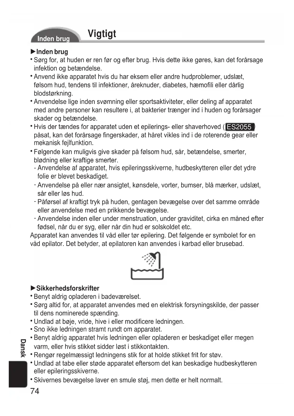 Frigöringsknapp för ramen Tillbehör: Laddare (RE7- 44), rengöringsborste och väska (Använd inte andra tillbehör än de som levereras med apparaten.)74 Dansk Vigtigt Inden brug 1Inden brug Sørg for, at huden er ren før og efter brug. Hvis dette ikke gøres, kan det forårsage infektion og betændelse. Anvend ikke apparatet hvis du har eksem eller andre hudproblemer, udslæt, følsom hud, tendens til infektioner, åreknuder, diabetes, hæmoli eller dårlig blodstørkning. Anvendelse lige inden svømning eller sportsaktiviteter, eller deling af apparatet med andre personer kan resultere i, at bakterier trænger ind i huden og forårsager skader og betændelse. Hvis der tændes for apparatet uden et epilerings- eller shaverhoved ( ES2055