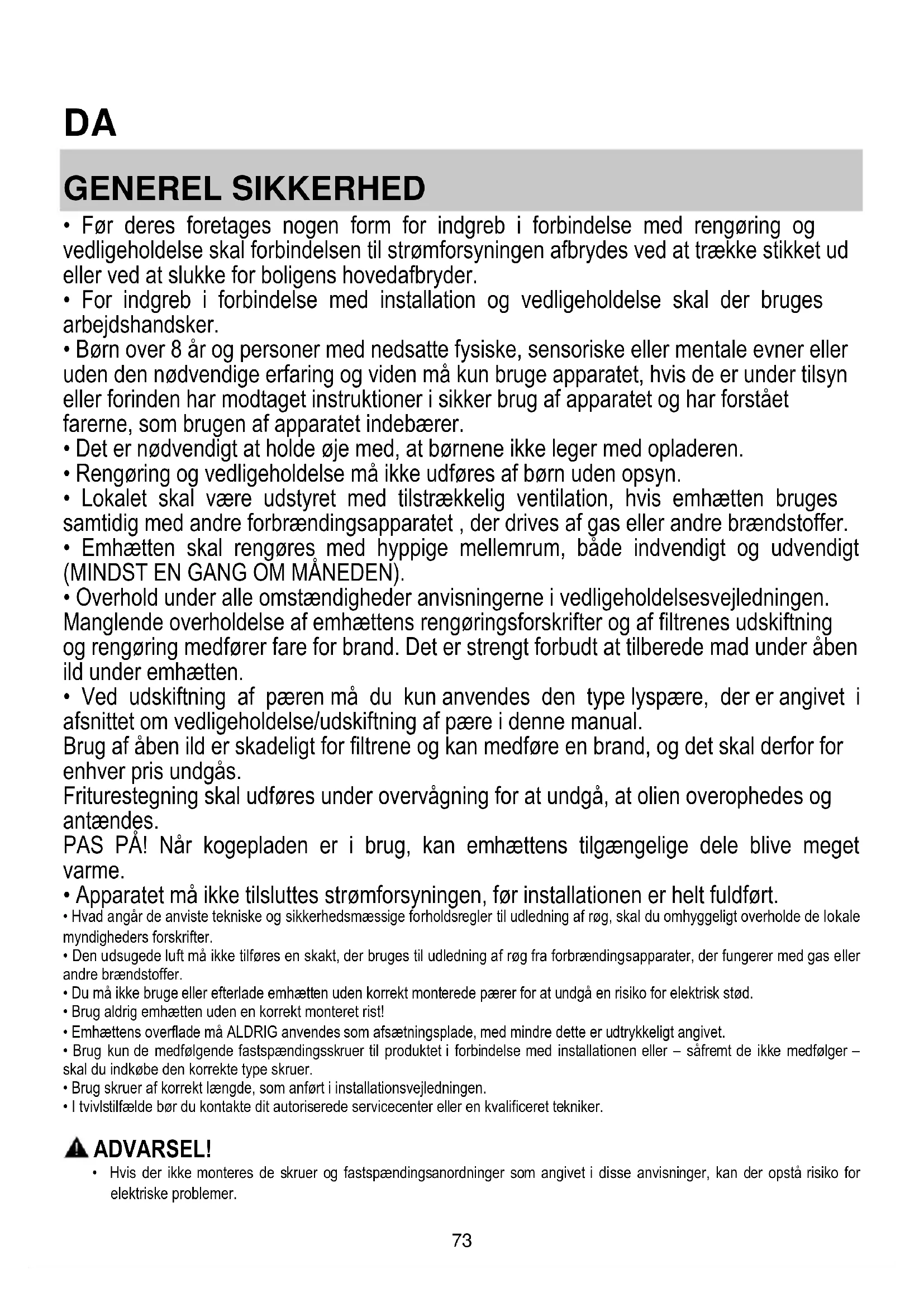 - Overhold under alle omstændigheder anvisningerne i vedligeholdelsesvejledningen. Manglende overholdelse af emhættens rengøringsforskrifter og af filtrenes udskiftning og rengøring medfører fare for brand. Det er strengt forbudt at tilberede mad under åben ild under emhætten.