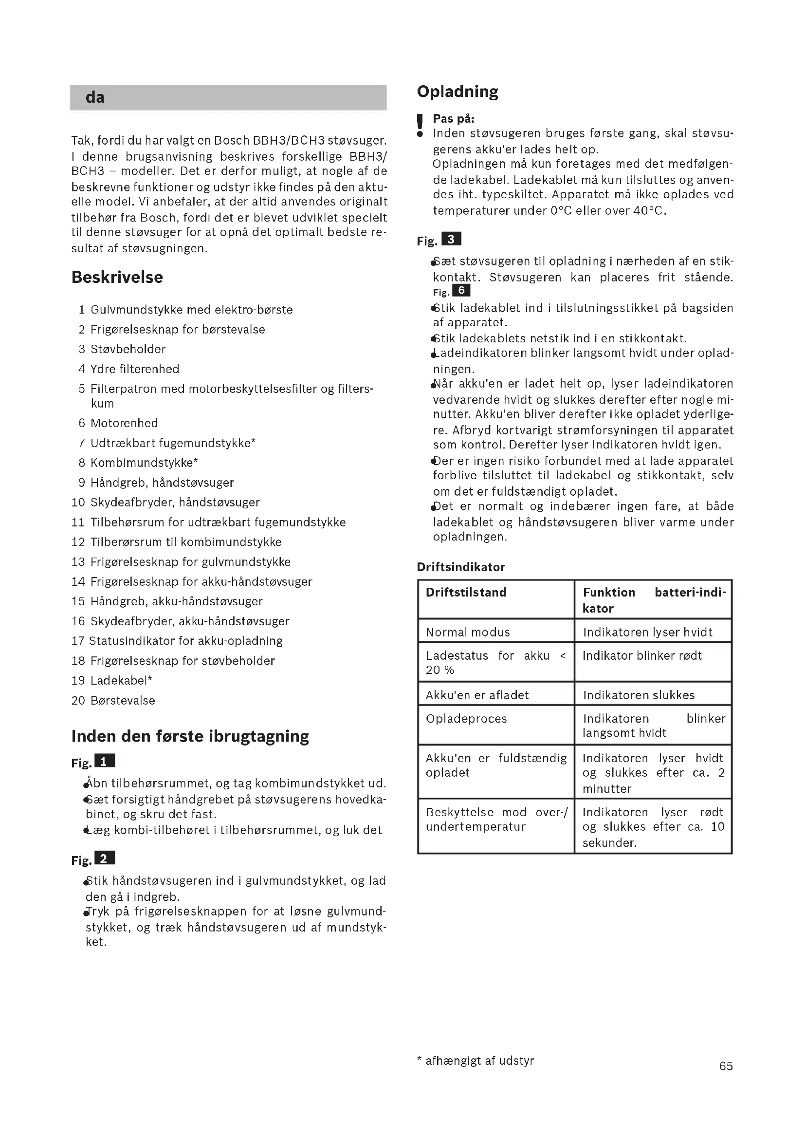 Tak, fordi du har valgt en Bosch BBH3/BCH3 støvsuger. I denne brugsanvisning beskrives forskellige BBH3/ BCH3 – modeller. Det er derfor muligt, at nogle af de beskrevne funktioner og udstyr ikke findes på den aktu- elle model. Vi anbefale r, at der altid anvendes originalt tilbehør fra Bosch, fordi det er blevet udviklet specielt til de nne støvsuger for at opnå det optimalt bedste re- sultat af støvsugningen. Beskrivelse 1 Gulvmundstykke med elektro-børste 2 Frigørelsesknap for børstevalse 3 Støvbeholder 4 Ydre filterenhed 5 Filterpatron med motorbeskyttelsesfilter og filters- kum 6 Motorenhed 7 Udtrækbart fugemundstykke* 8 Kombimundstykke* 9 Håndgreb, håndstøvsuger 10 Skydeafbryder, håndstøvsuger 11 Tilbehørsrum for udtrækbart fugemundstykke 12 Tilbe rørsrum til kombimundstykke 13 Frigørelsesknap for gulvmundstykke 14 Frigørelsesknap for akku-håndstøvsuger 15 Håndgreb, akku-håndstøvsuger 16 Skydeafbryder, akku-håndstøvsuger 17 Statusindikator for akku-opladning 18 Frigørelsesknap for støvbeholder 19 Ladekabel* 20 Børstevalse Inden den første ibrugtagning Fig.