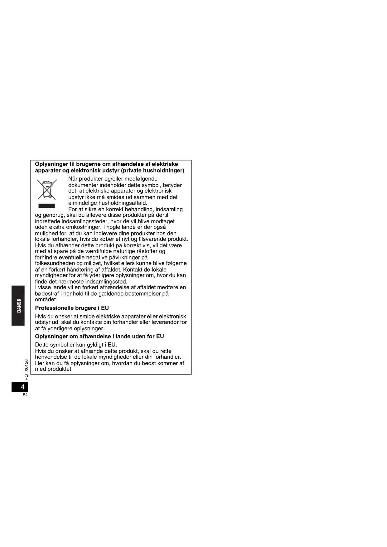 SH-FX67_RQTX0126_DA.fm Page 3 Thursday, November 29, 2007 10:19 PM4 RQTX0126 DANSK Oplysninger til brugerne om afhændelse af elektriske apparater og elektronisk udstyr (private husholdninger) Når produkter og/eller medfølgende dokumenter indeholder dette symbol, betyder det, at elektriske apparater og elektronisk udstyr ikke må smides ud sammen med det almindelige husholdningsaffald. For at sikre en korrekt behandling, indsamling og genbrug, skal du aflevere disse produkter på dertil indrettede indsamlingssteder, hvor de vil blive modtaget uden ekstra omkostninger. I nogle lande er der også mulighed for, at du kan indlevere dine produkter hos den lokale forhandler, hvis du køber et nyt og tilsvarende produkt. Hvis du afhænder dette produkt på korrekt vis, vil det være med at spare på de værdifulde naturlige råstoffer og forhindre eventuelle negative påvirkninger på folkesundheden og miljøet, hvilket ellers kunne blive følgerne af en forkert håndtering af affaldet. Kontakt de lokale myndigheder for at få yderligere oplysninger om, hvor du kan finde det nærmeste indsamlingssted. I visse lande vil en forkert afhændelse af affaldet medføre en bødestraf i henhold til de gældende bestemmelser på området. Professionelle brugere i EU Hvis du ønsker at smide elektriske apparater eller elektronisk udstyr ud, skal du kontakte din forhandler eller leverandør for at få yderligere oplysninger. Oplysninger om afhændelse i lande uden for EU Dette symbol er kun gyldigt i EU. Hvis du ønsker at afhænde dette produkt, skal du rette henvendelse til de lokale myndigheder eller din forhandler. Her kan du få oplysninger om, hvordan du bedst kommer af med produktet.