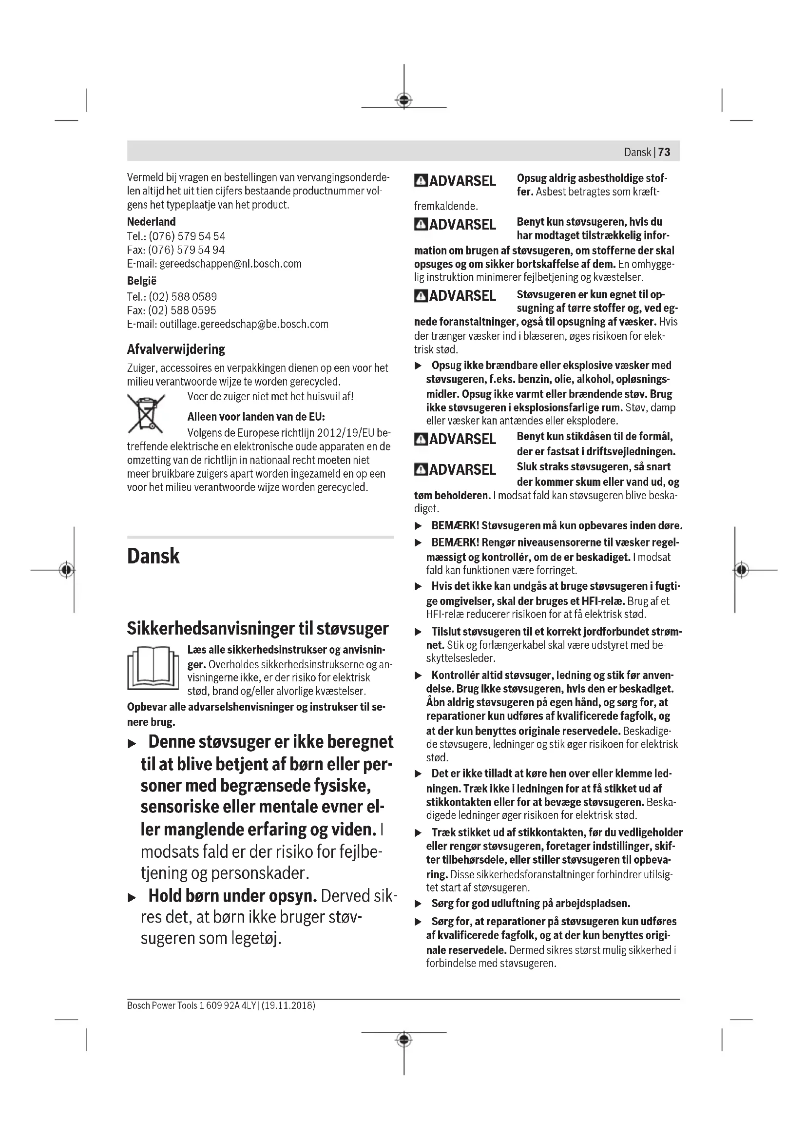 Brug kun støvsugeren, hvis du har fuldt overblik over alle funktioner og uden begrænsninger kan gennemføre dem, el- ler du har modtaget relevante anvisninger. Illustrerede komponenter Nummereringen af de illustrerede komponenter refererer til gengivelsen af støvsugeren på illustrationssiderne. (1) Beholder (2) Lukkeprop til udsugningstilslutning (3) Slangeholder (4) Holder til sugeslange (5) Stikkontakt til el-værktøj (6) Volumenstrømsregulator (7) Driftstype-valgkontakt (8) Sugeydelsesregulator (9) AFC-tast (10) Bæregreb (11) L-Boxx-holder (12) Støvsugeroverdel (13) Lukkemekanisme til støvsugeroverdel (14) Kørehjul (15) Styrehjulsbremse (16) Styrehjul (17) Kabelholder (18) Lukkeflig til filterafdækning (19) Holder til sugerør (20) Holder til fugemundstykke/krumt mundstykke (21) Holder til gulvmundstykke (22) Opsugningsadapter (23) Krumt mundstykke (24) Sugeslange (25) Bortskaffelsessæk (26) Fladfoldefilter (PES) (27) Fugemundstykke (28) Gummilæbe (29) Børstestrimmel (30) Gulvmundstykke (31) Sugerør (32) Holder til sugeslangeholder (33) Trykknap (34) Åbning til forkert luft (35) Kontrollysdiode (36) Filterafdækning (37) Niveausensorer Dansk | 75 Bosch Power Tools 1 609 92A 4LY | (19.11.2018)76 | Dansk 1 609 92A 4LY | (19.11.2018) Bosch Power Tools Tekniske data Våd-/tørsuger GAS 35 M AFC Varenummer 3 601 JC3 1.. 3 601 JC3 170 Nominel spænding V 220−240 110 Nominel optagen effekt W 1200 1000 Frekvens Hz 50–60 50–60 Beholdervolumen (brutto) l 35 35 Nettovolumen (væske) l 19 19 Støvposevolumen l 19 19 Maks. undertryk