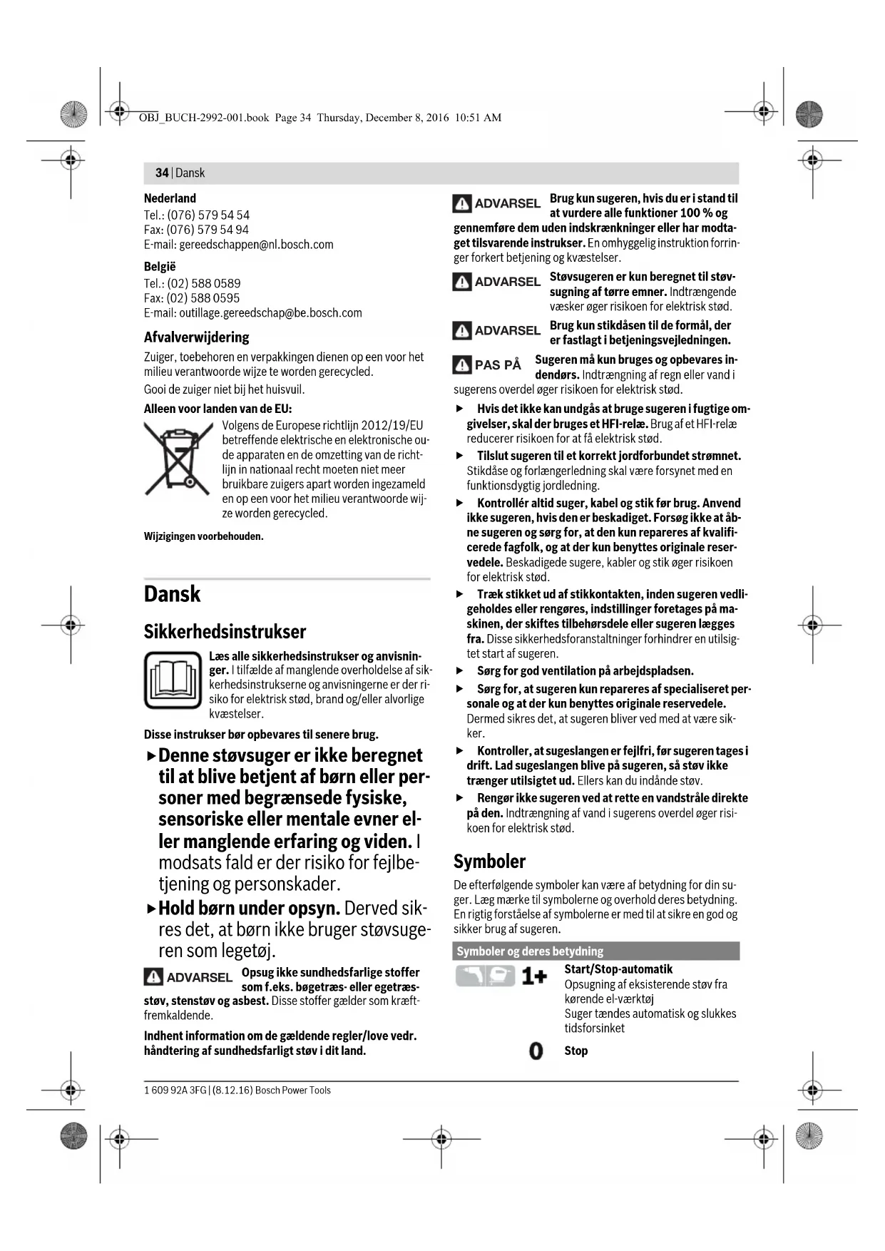 – Draag de zuiger alleen aan de draaggreep 5. Klantenservice en gebruiksadviezen Onze klantenservice beantwoordt uw vragen over reparatie en onderhoud van uw product en over vervangingsonderde- len. Explosietekeningen en informatie over vervangingson- derdelen vindt u ook op: www.bosch-pt.com Het Bosch-team voor gebruiksadviezen helpt u graag bij vra- gen over onze producten en toebehoren. Vermeld bij vragen en bestellingen van vervangingsonderde- len altijd het uit tien cijfers bestaande productnummer vol- gens het typeplaatje van het product. – Voor de inbedrijfstelling van de au- tomatische start/stop-functie van de zuiger zet u de moduskeuzescha- kelaar 2 op het symbool „Automati- sche start/stop”. –Om de zuiger uit te schakelen, zet u de mo- duskeuzeschakelaar 2 op het symbool „Uit- schakelen”. OBJ_BUCH-2992-001.book Page 33 Thursday, December 8, 2016 10:51 AM34 | Dansk 1 609 92A 3FG | (8.12.16) Bosch Power ToolsNederlandTel.: (076) 579 54 54Fax: (076) 579 54 94E-mail: gereedschappen@nl.bosch.comBelgiëTel.: (02) 588 0589Fax: (02) 588 0595E-mail: outillage.gereedschap@be.bosch.com Afvalverwijdering Zuiger, toebehoren en verpakkingen dienen op een voor het milieu verantwoorde wijze te worden gerecycled.Gooi de zuiger niet bij het huisvuil.Alleen voor landen van de EU:Volgens de Europese richtlijn 2012/19/EU betreffende elektrische en elektronische ou-de apparaten en de omzetting van de richt-lijn in nationaal recht moeten niet meer bruikbare zuigers apart worden ingezameld en op een voor het milieu verantwoorde wij-ze worden gerecycled.Wijzigingen voorbehouden. Dansk Sikkerhedsinstrukser Læs alle sikkerhedsinstrukser og anvisnin-ger. I tilfælde af manglende overholdelse af sik-kerhedsinstrukserne og anvisningerne er der ri-siko for elektrisk stød, brand og/eller alvorlige kvæstelser.Disse instrukser bør opbevares til senere brug. Denne støvsuger er ikke beregnet til at blive betjent af børn eller per- soner med begrænsede fysiske, sensoriske eller mentale evner el- ler manglende erfaring og viden. I modsats fald er der risiko for fejlbe- tjening og personskader. Hold børn under opsyn. Derved sik- res det, at børn ikke bruger støvsuge- ren som legetøj. Opsug ikke sundhedsfarlige stoffer som f.eks. bøgetræs- eller egetræs-støv, stenstøv og asbest. Disse stoffer gælder som kræft-fremkaldende.Indhent information om de gældende regler/love vedr. håndtering af sundhedsfarligt støv i dit land.Brug kun sugeren, hvis du er i stand til at vurdere alle funktioner 100 % og gennemføre dem uden indskrænkninger eller har modta-get tilsvarende instrukser. En omhyggelig instruktion forrin-ger forkert betjening og kvæstelser.Støvsugeren er kun beregnet til støv-sugning af tørre emner. Indtrængende væsker øger risikoen for elektrisk stød.Brug kun stikdåsen til de formål, der er fastlagt i betjeningsvejledningen.Sugeren må kun bruges og opbevares in-dendørs. Indtrængning af regn eller vand i sugerens overdel øger risikoen for elektrisk stød. Hvis det ikke kan undgås at bruge sugeren i fugtige om-givelser, skal der bruges et HFI-relæ. Brug af et HFI-relæ reducerer risikoen for at få elektrisk stød. Tilslut sugeren til et korrekt jordforbundet strømnet. Stikdåse og forlængerledning skal være forsynet med en funktionsdygtig jordledning. Kontrollér altid suger, kabel og stik før brug. Anvend ikke sugeren, hvis den er beskadiget. Forsøg ikke at åb-ne sugeren og sørg for, at den kun repareres af kvalifi-cerede fagfolk, og at der kun benyttes originale reser- vedele. Beskadigede sugere, kabler og stik øger risikoen for elektrisk stød. Træk stikket ud af stikkontakten, inden sugeren vedli-geholdes eller rengøres, indstillinger foretages på ma-skinen, der skiftes tilbehørsdele eller sugeren lægges fra. Disse sikkerhedsforanstaltninger forhindrer en utilsig- tet start af sugeren. Sørg for god ventilation på arbejdspladsen. Sørg for, at sugeren kun repareres af specialiseret per-sonale og at der kun benyttes originale reservedele. Dermed sikres det, at sugeren bliver ved med at være sik- ker. Kontroller, at sugeslangen er fejlfri, før sugeren tages i drift. Lad sugeslangen blive på sugeren, så støv ikke trænger utilsigtet ud. Ellers kan du indånde støv. Rengør ikke sugeren ved at rette en vandstråle direkte på den. Indtrængning af vand i sugerens overdel øger risi-koen for elektrisk stød. Symboler De efterfølgende symboler kan være af betydning for din su-ger. Læg mærke til symbolerne og overhold deres betydning. En rigtig forståelse af symbolerne er med til at sikre en god og sikker brug af sugeren. ADVARSEL Symboler og deres betydningStart/Stop-automatikOpsugning af eksisterende støv fra kørende el-værktøjSuger tændes automatisk og slukkes tidsforsinket Stop ADVARSEL ADVARSEL ADVARSEL PAS P