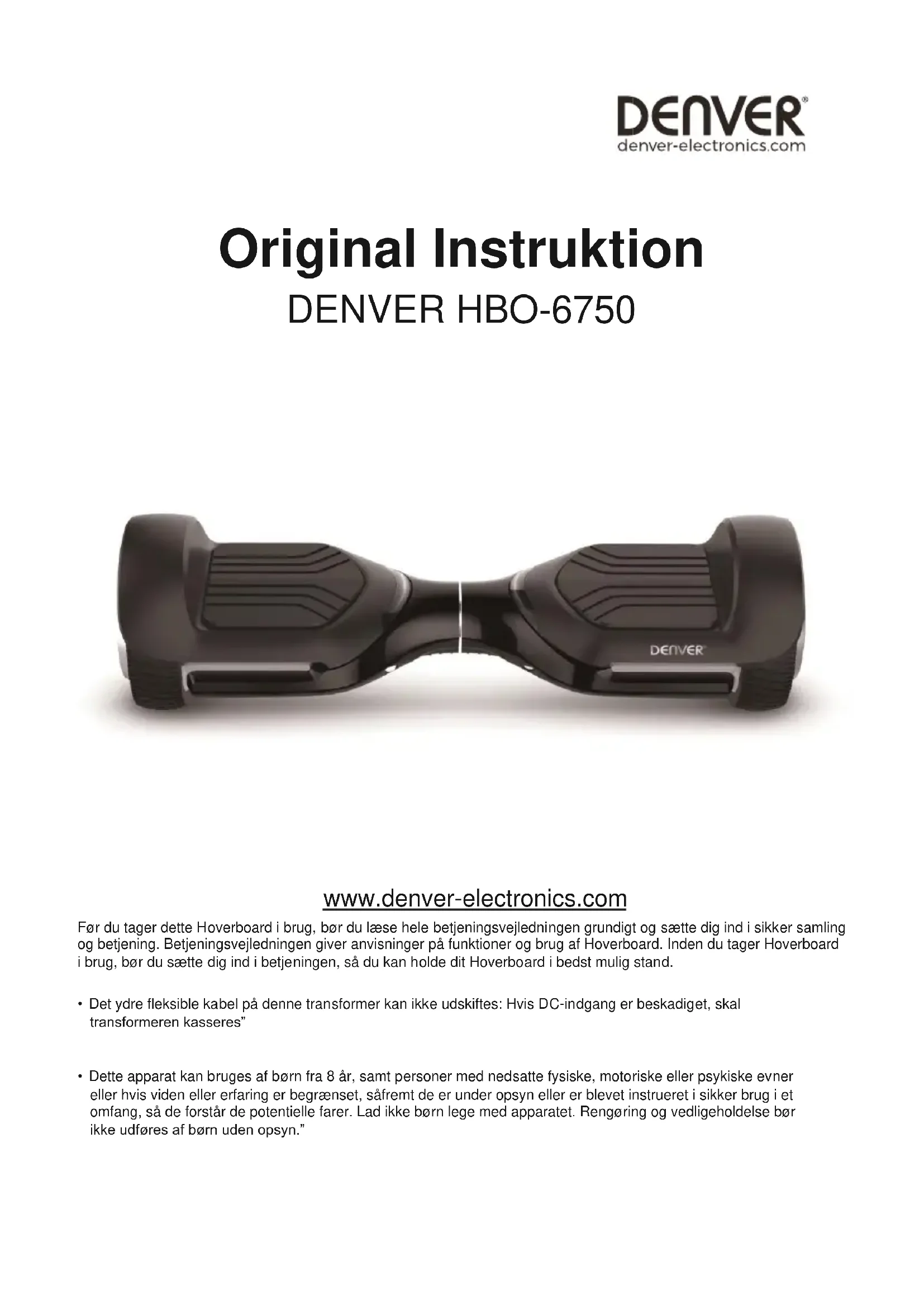 th. July 2020Original Instruktion DENVER HBO-6750 www.denver-electronics.com Før du tager dette Hoverboard i brug, bør du læse hele betjeningsvejledningen grundigt og sætte dig ind i sikker samling og betjening. Betjeningsvejledningen giver anvisninger på funktioner og brug af Hoverboard. Inden du tager Hoverboard i brug, bør du sætte dig ind i betjeningen, så du kan holde dit Hoverboard i bedst mulig stand.