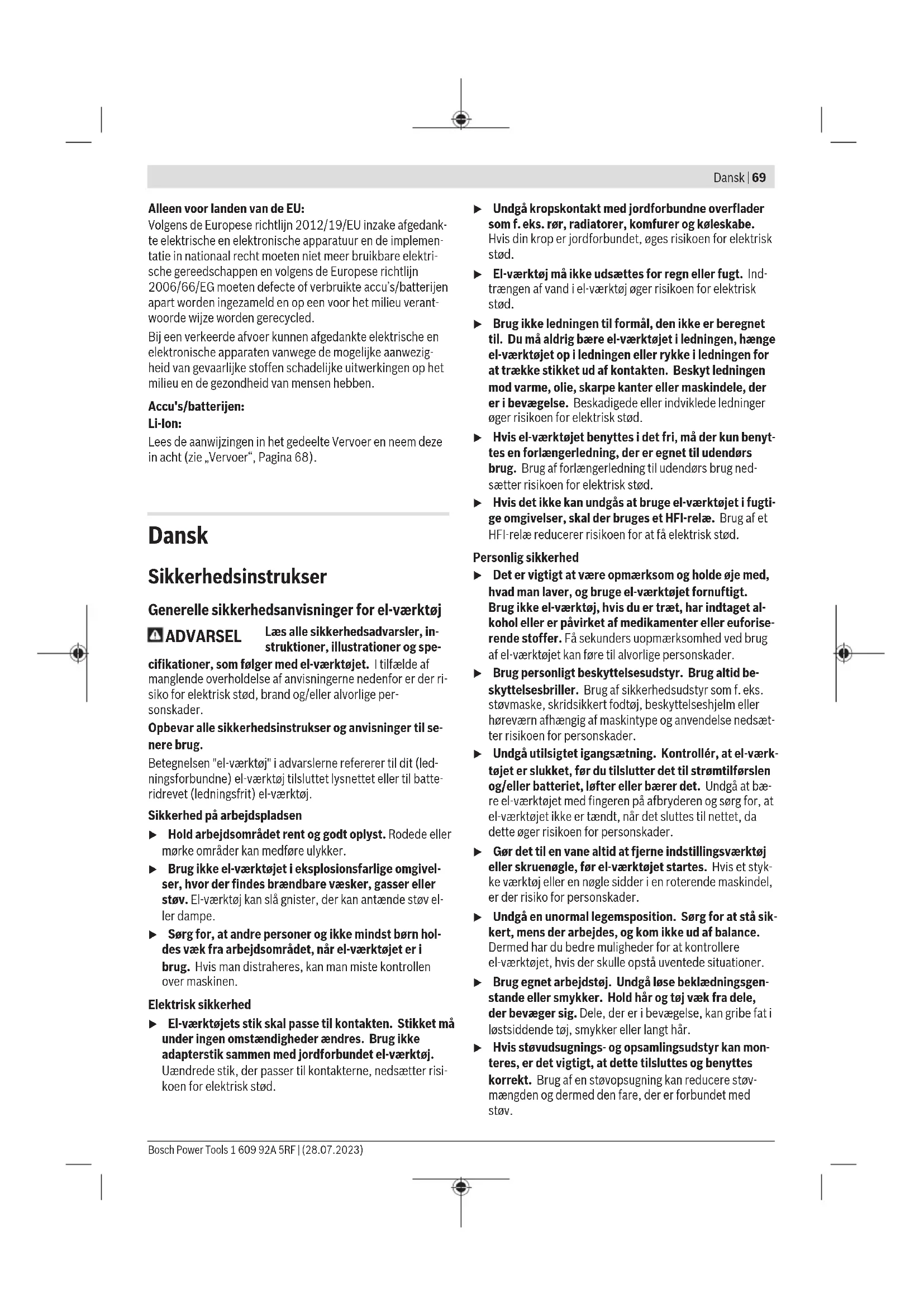 Det svingningsniveau og støjemissionsniveau, der fremgår af anvisningerne, er målt iht. en standardiseret måleværdi og kan anvendes til sammenligning af elværktøj med hinanden. De er også egnet til en foreløbig vurdering af svingnings- og støjemissionen. Det angivne svingnings- og støjemissionsniveau repræsente- rer de væsentlige anvendelser af el‑værktøjet. Hvis el‑værk- tøjet dog anvendes til andre formål, med afvigende indsats- værktøj eller utilstrækkelig vedligeholdelse, kan svingnings- og støjemissionsniveauet afvige. Dette kan føre til en betyde- lig forøgelse af svingnings- og støjemissionen i hele arbejds- tidsrummet. Til en nøjagtig vurdering af svingnings- og støjemissionen bør der også tages højde for de tider, i hvilke værktøjet er sluk- ket eller godt nok kører, men rent faktisk ikke anvendes. Det- te kan føre til en betydelig reduktion af svingnings- og støje- missionsniveauet i hele arbejdstidsrummet. Fastlæg ekstra sikkerhedsforanstaltninger til beskyttelse af brugeren mod svingningers virkning som f.eks.: Vedligehol- delse af el‑værktøj og indsatsværktøj, holde hænder varme, organisation af arbejdsforløb. Akku Bosch sælger også akku-værktøjer uden akku. Om der følger en akku med din leverance fremgår af emballagen. Bosch Power Tools 1 609 92A 5RF | (28.07.2023)74 | Dansk Opladning af akku u Brug kun de ladeaggregater, der fremgår af de tekni- ske data. Kun disse ladeaggregater er afstemt i forhold til den Li-ion-akku, der bruges på dit el-værktøj. Bemærk! Lithium-ion-akkuer udleveres delvis opladet på grund af internationale transportforskrifter. For at sikre at akkuen fungerer 100%, skal du oplade akkuen helt i op- laderen før første ibrugtagning. Isætning af akku Skub den opladede akkuind i akkuholderen, så den går hør- bart i indgreb. Udtagning af akku Akkuen tages ud ved at trykke på akku-oplåsningsknap- penog trække akkuen ud af el-værktøjet. Undgå brug af vold. Akku-ladetilstandsindikator De 3 grønne lysdioder i akku-ladetilstandsindikatorenviser akkuensladetilstand. Ladetilstandsindikatoren lyser kun 3sek., efter at der er tændt. LED Kapacitet Konstant lys 3× grøn 60–100% Konstant lys 2× grøn 30–60% Konstant lys 1× grøn 5–30% Blinkende lys 1× grøn 0–5% Temperaturafhængig overbelastningsbeskyttelse Ved korrekt brug kan el-værktøjet ikke blive overbelastet. Hvis belastningen bliver for stor, eller det tilladte temperatu- rområde overskrides, reduceres omdrejningstallet, eller el- værktøjet slukker. Når omdrejningstallet er reduceret, kører el-værktøjet først med fuldt omdrejningstal, når det tilladte batteritemperaturområde er nået, eller belastningen er redu- ceret. Ved automatisk frakobling slukker du el-værktøjet, lader akkuen køle af og tænder el-værktøjet igen. Visning for temperaturovervågning/ overbelastningsbeskyttelse Den røde LED-lampehjælper dig med at beskytte akkuen mod overophedning og motoren mod overbelastning. Hvis LED-lampen lyser rødt hele tiden, er akkuens tempera- tur for høj, og el-værktøjet standser automatisk. – Sluk el-værktøjet. – Lad akkuen køle af, før du arbejder videre. Hvis LED-lampenblinker rødt, er el-værktøjet blokeret og slukker automatisk. Træk el-værktøjet ud af emnet. Så snart blokeringen er afhjulpet, arbejder el-værktøjet vi- dere. Henvisninger til optimal håndtering af akkuen Beskyt akkuen mod fugtighed og vand. Opbevar kun akkuen i et temperaturområde fra −20°C til 50°C. Opbevar ikke akkuen i bilen f.eks. om sommeren. Når driftstiden pr. opladning forkortes væsentligt, er det tegn på, at akkuerne er slidt op og skal udskiftes. Læs og overhold henvisningerne mht. bortskaffelse. Montering Montering af beskyttelsesanordning u Tag altid akkuen ud af el‑værktøjet, før der arbejdes på el‑værktøjet (f.eks. vedligeholdelse, værktøjsskift osv.) samt før det transporteres og lægges til opbeva- ring. Utilsigtet aktivering af start-stop-kontakten er for- bundet med kvæstelsesfare. Bemærk: Efter brud på slibeskiven under arbejdet eller be- skadigelse af holdeanordningerne på beskyttelseskappen/ el-værktøjet skal el-værktøjet omgående sendes til et autori- seret værksted, adresser se afsnittet "Kundeservice og anvendelsesrådgivning". Beskyttelsesskærm til slibning u Brug altid beskyttelsesskærmen til slibning(7). Beskyttelsesskærm til skæring u Brug altid beskyttelsesskærmen til skæring ved skæring(10). u Sørg for tilstrækkelig støvopsugning, når der skæres i sten. Montering af beskyttelsesskærm (se billede A) Sæt beskyttelsesskærmen til skæring (10) på beskyttelses- skærmen til slibning (7), indtil den går i indgreb. Indstilling af beskyttelsesskærm (se billede A) Drej beskyttelsesskærmen til den ønskede position, og lad den gå i indgreb. Det er ikke nødvendigt at bruge værktøj. u Indstil beskyttelsesskærmen (7) , så betjeningsperso- nen ikke udsættes for gnistregn. Montering af slibeværktøj u Tag altid akkuen ud af el‑værktøjet, før der arbejdes på el‑værktøjet (f.eks. vedligeholdelse, værktøjsskift osv.) samt før det transporteres og lægges til opbeva- ring. Utilsigtet aktivering af start-stop-kontakten er for- bundet med kvæstelsesfare. u Rør ikke ved slibe- og skæreskiverne, før de er kølet af. Skiverne bliver meget varmt under arbejdet. Rengør slibespindlen (8) og alle dele, der skal monteres. For at spænde eller løsne slibeværktøjet skal du skubbe spindellåseknappen (2) fremad og samtidig dreje på slibe- værktøjet, så slibespindlen låses. u Aktivér kun spindellåsetasten, når slibespindlen står stille. Ellers kan el‑værktøjet blive beskadiget. Slibe-/skæreskive Vær opmærksom på slibeværktøjernes dimensioner. Huldia- meteren skal passe til holdeflangen. Brug hverken adaptere eller reduktionsstykker. 1 609 92A 5RF | (28.07.2023) Bosch Power ToolsDansk | 75 Sørg ved anvendelse af diamantskæres