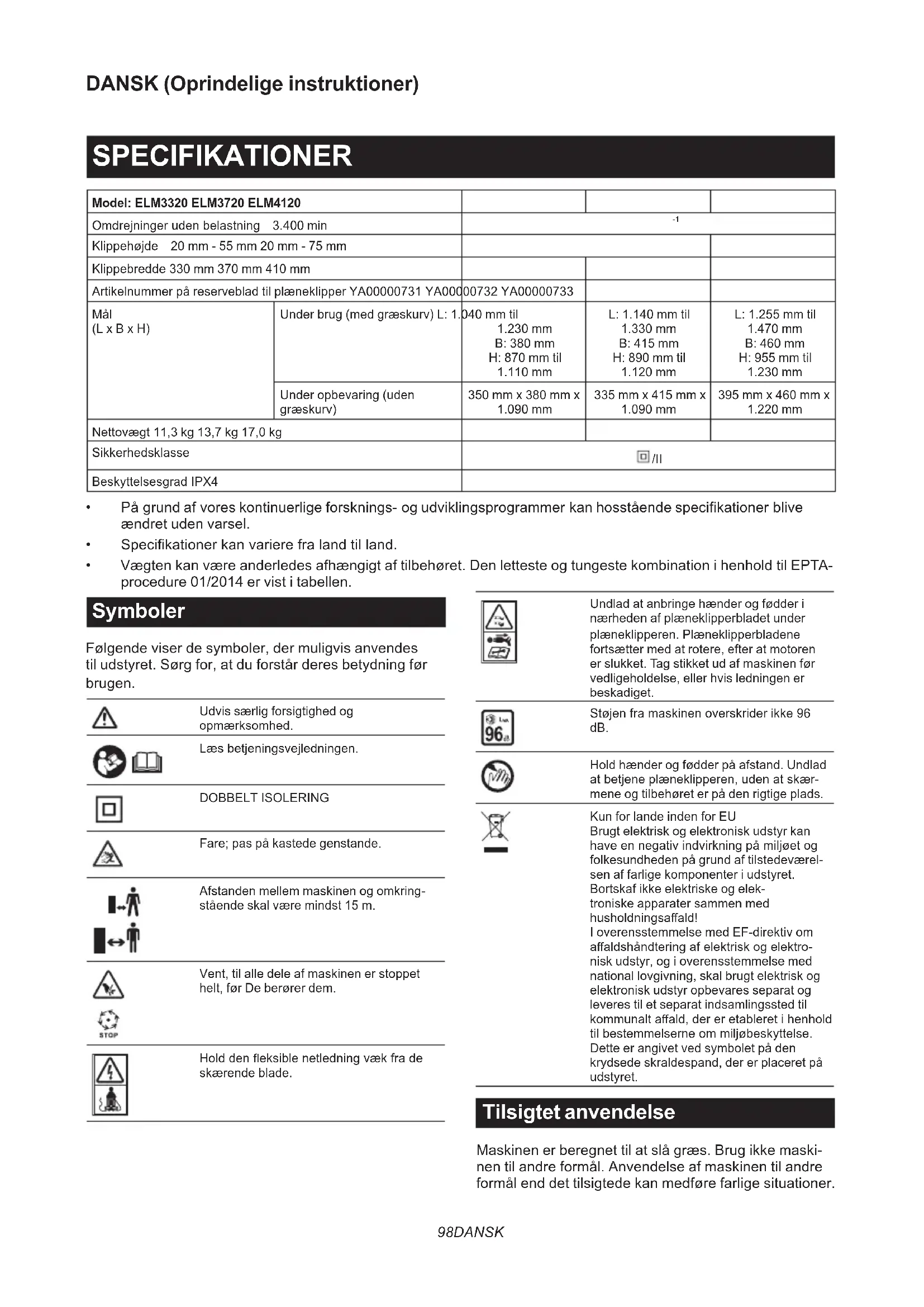 - Vægten kan være anderledes afhængigt af tilbehøret. Den letteste og tungeste kombination i henhold til EPTA- procedure 01/2014 er vist i tabellen. Symboler Følgende viser de symboler, der muligvis anvendes til udstyret. Sørg for, at du forstår deres betydning før brugen. Udvis særlig forsigtighed og opmærksomhed. Læsbetjeningsvejledningen. DOBBELT ISOLERING Fare; pas på kastede genstande. Afstanden mellem maskinen og omkring- stående skal være mindst 15 m. Vent, til alle dele af maskinen er stoppet helt, før De berører dem. Holddeneksiblenetledningvækfrade skærende blade. Undlad at anbringe hænder og fødder i nærheden af plæneklipperbladet under plæneklipperen. Plæneklipperbladene fortsætter med at rotere, efter at motoren er slukket. Tag stikket ud af maskinen før vedligeholdelse, eller hvis ledningen er beskadiget. Støjenframaskinenoverskriderikke96 dB. Hold hænder og fødder på afstand. Undlad atbetjeneplæneklipperen,udenatskær- mene og tilbehøret er på den rigtige plads. Kun for lande inden for EU Brugt elektrisk og elektronisk udstyr kan haveennegativindvirkningpåmiljøetog folkesundheden på grund af tilstedeværel- sen af farlige komponenter i udstyret. Bortskaf ikke elektriske og elek- troniske apparater sammen med husholdningsaald! I overensstemmelse med EF-direktiv om aaldshåndteringafelektriskogelektro- nisk udstyr, og i overensstemmelse med national lovgivning, skal brugt elektrisk og elektronisk udstyr opbevares separat og leveres til et separat indsamlingssted til kommunaltaald,dereretableretihenhold tilbestemmelserneommiljøbeskyttelse. Dette er angivet ved symbolet på den krydsede skraldespand, der er placeret på udstyret. Tilsigtet anvendelse Maskinen er beregnet til at slå græs. Brug ikke maski- nen til andre formål. Anvendelse af maskinen til andre formål end det tilsigtede kan medføre farlige situationer.99 DANSK Strømforsyning Maskinen må kun tilsluttes en strømforsyning med samme spænding som angivet på typeskiltet og kan kun anvendes på enfaset vekselstrømsforsyning. Den er dobbeltisoleret og kan derfor også tilsluttes netstik udenjordforbindelse. Hvis netledningen er beskadiget, skal den udskiftes hos producenten eller dennes serviceagent for at undgå en sikkerhedsrisiko. For oentlige lavspændingsnet på mellem 220 V og 250 V Til- og frakobling af elektriske apparater medfører spændingsudsving. Brug af dette apparat under ugun- stigeforholdpåelnettetkanhavenegativindydelse på funktionaliteten af andet udstyr. Hvis impedansen i elnettet er mindre end eller lig med 0,425 Ohm (for ELM3720) eller 0,427 Ohm (for ELM4120), kan det antages,atderikkevilværenegativeeekter.Den stikkontakt, der benyttes til dette apparat, skal være beskyttet med en sikring eller beskyttende kredsløbsaf- bryder med langsom udløsning. Lyd Gældende standard : EN IEC 62841-4-3 Model Lydtrykniveau Lydeektniveau