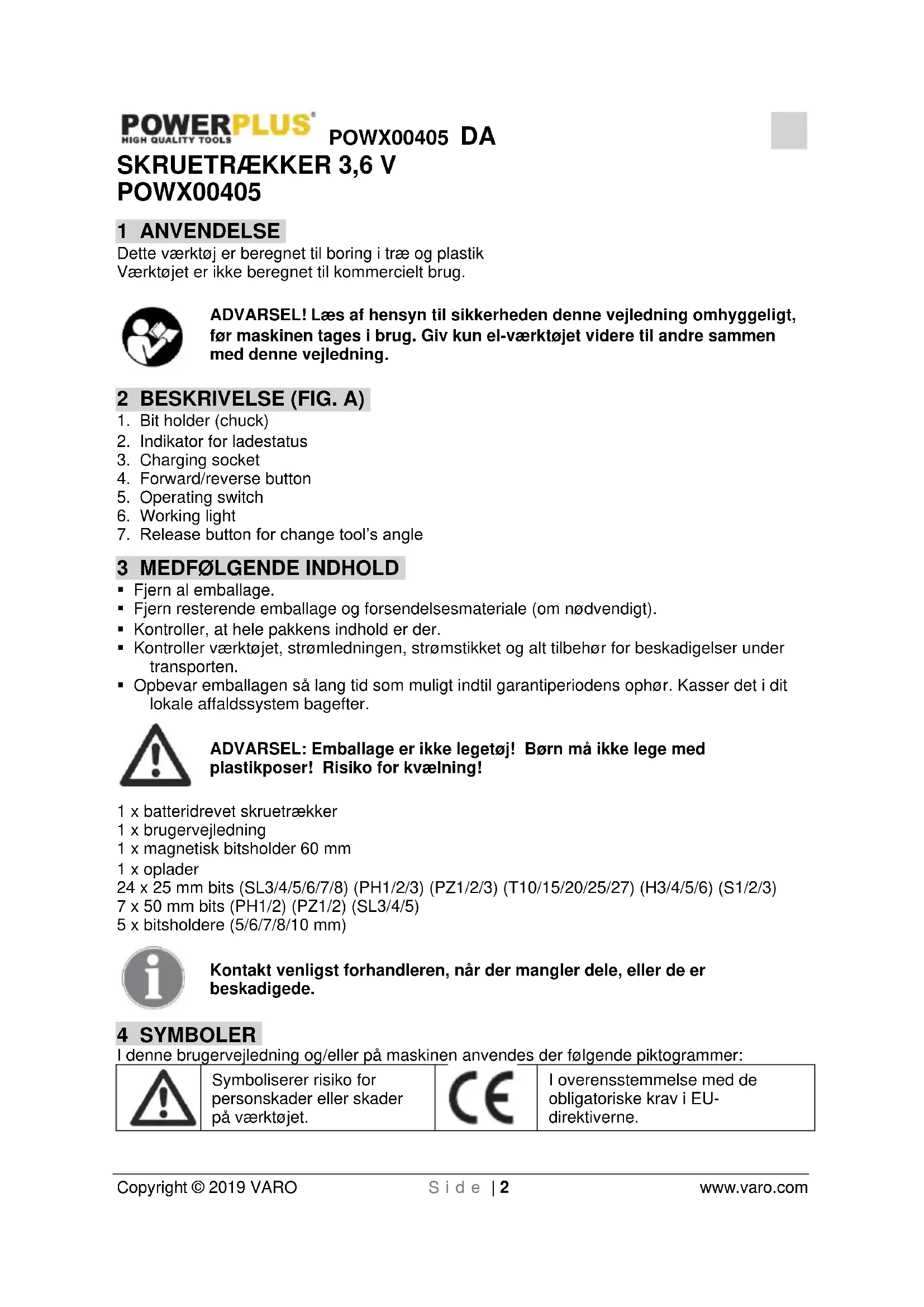 - Det samlede værktøj skal returneres til forhandleren i rimelig ren stand, i den originale blæseformede æske (hvis relevant for enheden) sammen med købsdokumentation. 12 MILJØ Hvis maskinen skal skiftes ud efter lang tids brug, må den ikke bortskaffes som husholdningsaffald, men skal bortskaffes på en miljømæssigt forsvarlig måde. Affald produceret af de elektriske maskiner må ikke behandles som normalt husaffald. Sørg for at genbruge det, hvor der findes egnede anlæg til det. Kontakt den lokale instans eller forhandleren for at få rådgivning om indsamling og bortskaffelse.POWX00405 DA Copyright © 2019 VARO S i d e | 8 www.varo.com 13 KONFORMITETSERKLÆRING VARO N.V – Joseph Van Instraat 9 – BE2500 Lier – Belgien, erklærer hermed, at Apparatbeskrivelse: Skruetrækker 3,6 V Varemærke: POWERplus Varenummer: POWX00405 er i overensstemmelse med de væsentlige krav og andre relevante bestemmelser i gældende europæiske direktiver, der er baseret på anvendelse af europæiske harmoniserede standarder. Enhver uautoriseret modifikation af apparatet ugyldiggør denne erklæring. EU-direktiver (herunder eventuelle tillæg frem til datoen for undertegnelsen): 2011/65/EU 2014/30/EU 2006/42/EC Harmoniserede europæiske standarder (herunder eventuelle tillæg frem til datoen for undertegnelsen): EN60745-1 : 2009 EN60745-2-2 : 2010 EN55014-1 : 2017 EN55014-2 : 2015 Indehaver af den tekniske dokumentation: Philippe Vankerkhove, VARO - Vic. Van Rompuy N.V. Undertegnede handler på vegne af selskabets administrerende direktør, Hufo Cuypers Regulatory Affairs (afdelingen for juridiske anliggender) – Compliance Manager Lier, 08/11/2018POWX00405 SV Copyright © 2019 VARO S i d a | 1 www.varo.com