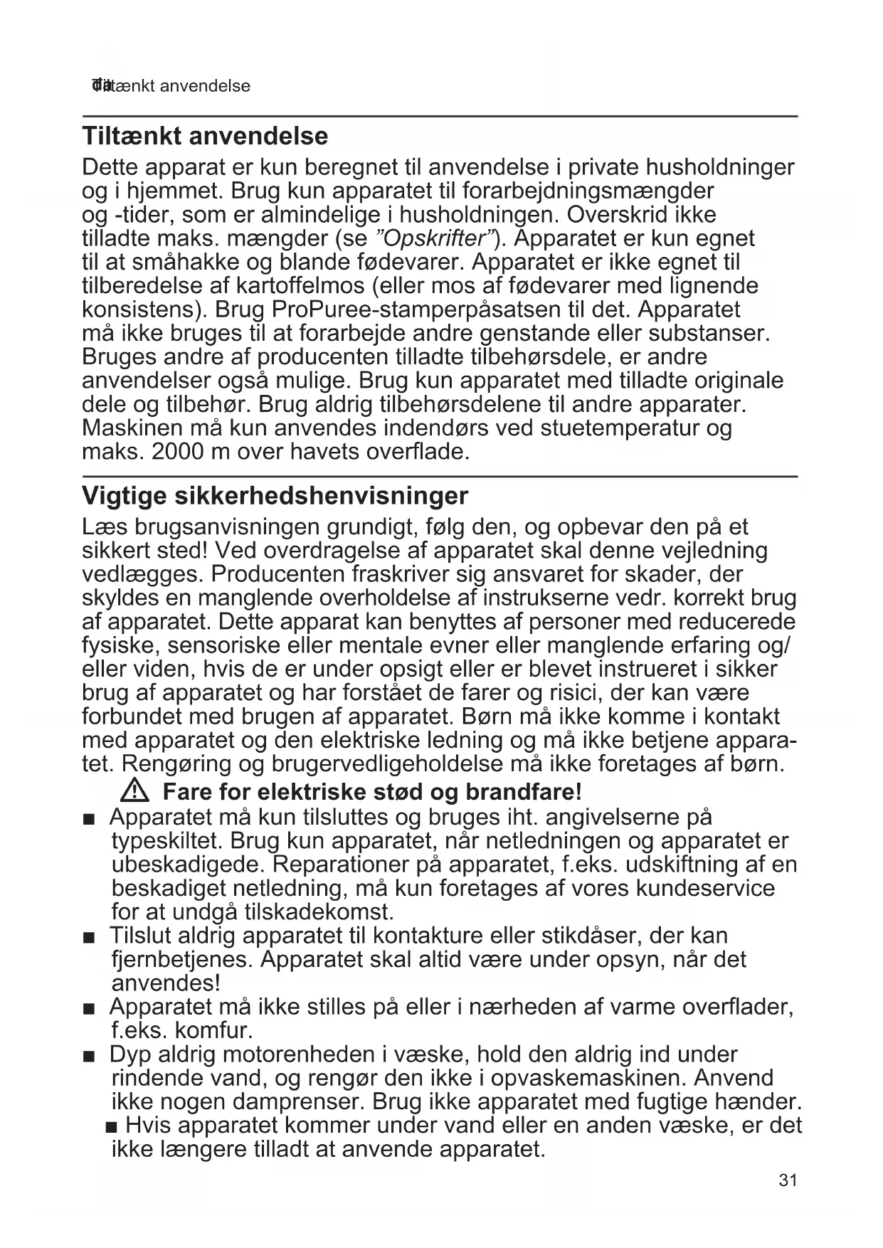 - Tiltænkt anvendelse Tiltænkt anvendelse Dette apparat er kun beregnet til anvendelse i private husholdninger og i hjemmet. Brug kun apparatet til forarbejdningsmængder og -tider, som er almindelige i husholdningen. Overskrid ikke tilladte maks. mængder (se ”Opskrifter”). Apparatet er kun egnet til at småhakke og blande fødevarer. Apparatet er ikke egnet til tilberedelse af kartoffelmos (eller mos af fødevarer med lignende konsistens). Brug ProPuree-stamperpåsatsen til det. Apparatet må ikke bruges til at forarbejde andre genstande eller substanser. Bruges andre af producenten tilladte tilbehørsdele, er andre anvendelser også mulige. Brug kun apparatet med tilladte originale dele og tilbehør. Brug aldrig tilbehørsdelene til andre apparater. Maskinen må kun anvendes indendørs ved stuetemperatur og maks. 2000 m over havets overflade. Vigtige sikkerhedshenvisninger Læs brugsanvisningen grundigt, følg den, og opbevar den på et sikkert sted! Ved overdragelse af apparatet skal denne vejledning vedlægges. Producenten fraskriver sig ansvaret for skader, der skyldes en manglende overholdelse af instrukserne vedr. korrekt brug af apparatet. Dette apparat kan benyttes af personer med reducerede fysiske, sensoriske eller mentale evner eller manglende erfaring og/ eller viden, hvis de er under opsigt eller er blevet instrueret i sikker brug af apparatet og har forstået de farer og risici, der kan være forbundet med brugen af apparatet. Børn må ikke komme i kontakt med apparatet og den elektriske ledning og må ikke betjene appara- tet. Rengøring og brugervedligeholdelse må ikke foretages af børn. W Fare for elektriske stød og brandfare! ■ Apparatet må kun tilsluttes og bruges iht. angivelserne på typeskiltet. Brug kun apparatet, når netledningen og apparatet er ubeskadigede. Reparationer på apparatet, f.eks. udskiftning af en beskadiget netledning, må kun foretages af vores kundeservice for at undgå tilskadekomst. ■ Tilslut aldrig apparatet til kontakture eller stikdåser, der kan fjernbetjenes. Apparatet skal altid være under opsyn, når det anvendes! ■ Apparatet må ikke stilles på eller i nærheden af varme overflader, f.eks. komfur. ■ Dyp aldrig motorenheden i væske, hold den aldrig ind under rindende vand, og rengør den ikke i opvaskemaskinen. Anvend ikke nogen damprenser. Brug ikke apparatet med fugtige hænder. ■ Hvis apparatet kommer under vand eller en anden væske, er det ikke længere tilladt at anvende apparatet.32 da Vigtige sikkerhedshenvisninger ■ Blenderfoden må maksimalt dyppes ned i fødevarerne indtil markeringen Í, da der ellers er fare for elektrisk stød! ■ Apparatet skal efter hver brug, når det ikke er under opsyn, altid afbrydes fra strømnettet, før det samles, adskilles eller rengøres og i tilfælde af fejl. W Fare for tilskadekomst! ■ Apparatet skal efter hver brug, når det ikke er under opsyn, altid afbrydes fra strømnettet, før det samles, adskilles eller rengøres og i tilfælde af fejl. ■ Drevet kører stadig lidt kort efter, at apparatet er slukket. Vent, til drevet står helt stille. ■ Grib aldrig ind i blenderfodkniven. Rengør aldrig blenderfodkniven med de bare fingre. W Fare for skoldning! Forsigtig ved forarbejdning af varme fødevarer. Varme fødevarer kan sprøjte ved forarbejdningen. W Kvælningsfare! Lad ikke børn lege med emballagen. W Bemærk! ■ Det anbefales, at apparatet kun er tændt, så længe fødevarerne forarbejdes. Brug ikke apparatet i tomgang. ■ Blenderbægeret er ikke egnet til brug i mikrobølgeovnen. ■ Stil aldrig blenderfoden på varme overflader eller ned i meget varme fødevarer. Lad kogende fødevarer afkøle til mindst 80 °C før forarbejdning. Skal blenderen bruges i en varm gryde, skal gryden fjernes fra kogepladen, før blenderen tages i brug. W Vigtigt! Rengør altid apparatet grundigt efter hver brug eller efter længere tid, hvor det ikke har været i brug. X ”Rengøring” se side 34 Tillykke med købet af dit nye apparat fra firmaet Bosch. Yderligere informationer om vores produkter finder du på vores internetside. Indhold Tiltænkt anvendelse p. 31