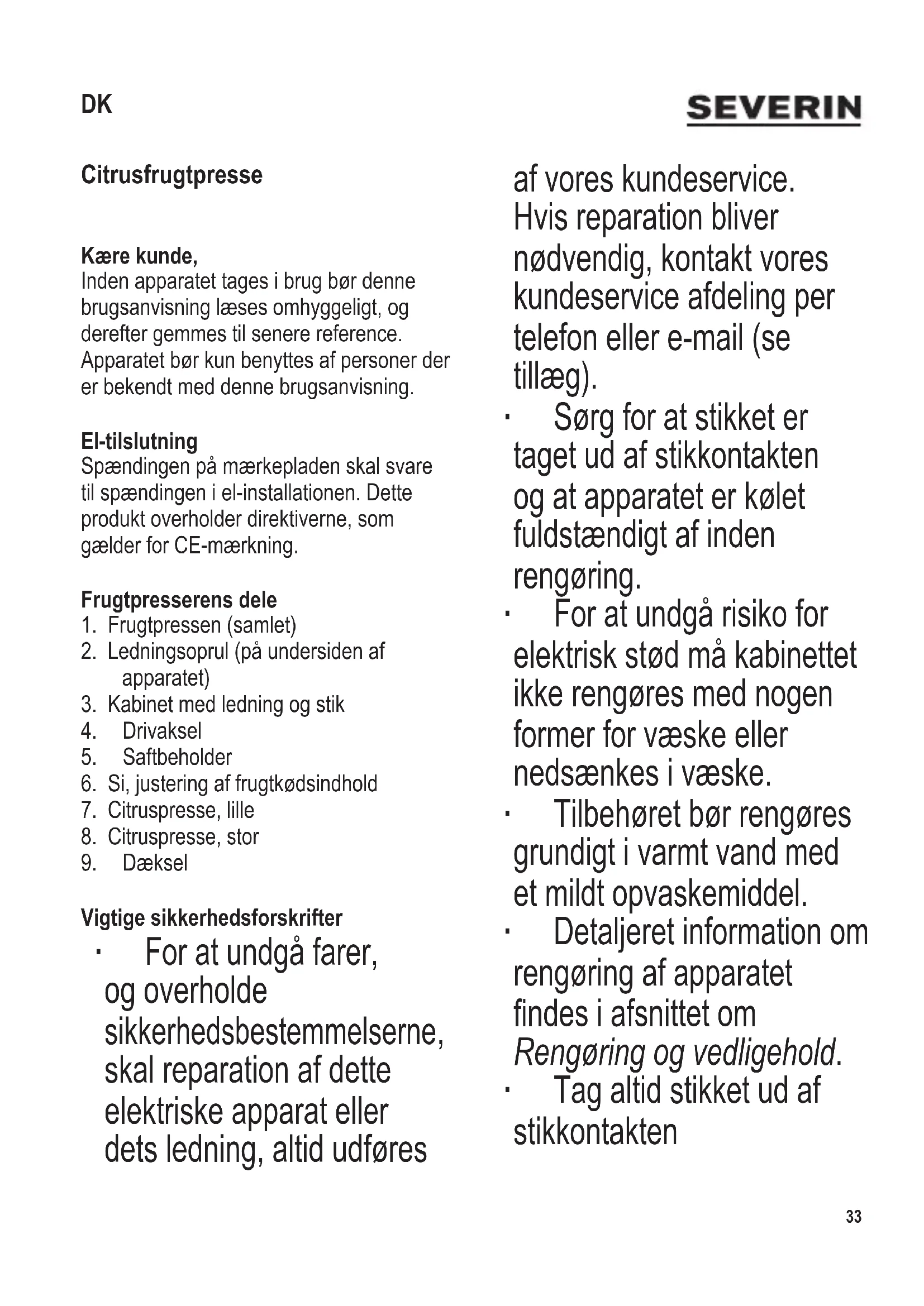 Citrusfrugtpresse Kære kunde, Inden apparatet tages i brug bør denne brugsanvisning læses omhyggeligt, og derefter gemmes til senere reference. Apparatet bør kun benyttes af personer der er bekendt med denne brugsanvisning. El-tilslutning Spændingen på mærkepladen skal svare til spændingen i el-installationen. Dette produkt overholder direktiverne, som gælder for CE-mærkning. Frugtpresserens dele