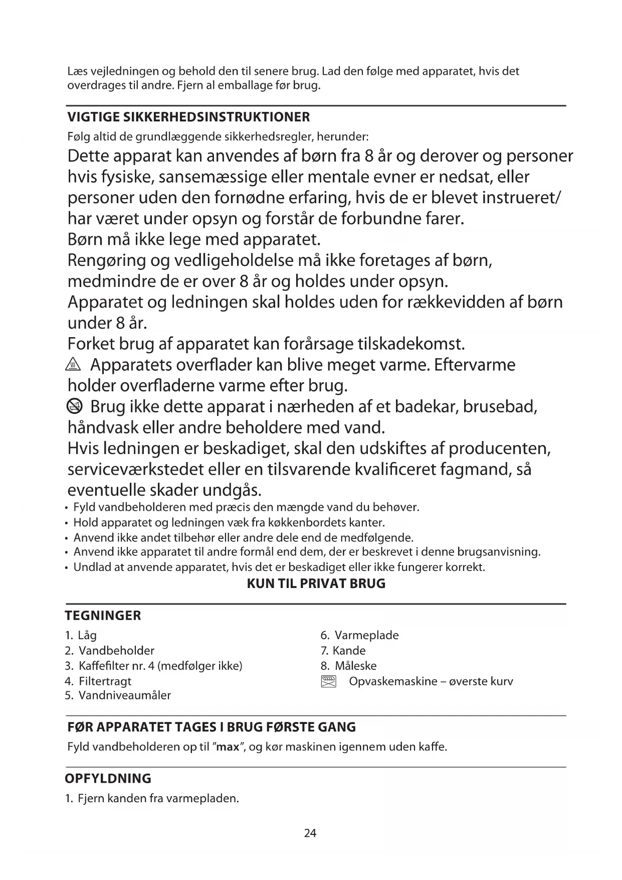 AE24 Læs vejledningen og behold den til senere brug. Lad den følge med apparatet, hvis det overdrages til andre. Fjern al emballage før brug. VIGTIGE SIKKERHEDSINSTRUKTIONER Følg altid de grundlæggende sikkerhedsregler, herunder: Dette apparat kan anvendes af børn fra 8 år og derover og personer hvis fysiske, sansemæssige eller mentale evner er nedsat, eller personer uden den fornødne erfaring, hvis de er blevet instrueret/ har været under opsyn og forstår de forbundne farer. Børn må ikke lege med apparatet. Rengøring og vedligeholdelse må ikke foretages af børn, medmindre de er over 8 år og holdes under opsyn. Apparatet og ledningen skal holdes uden for rækkevidden af børn under 8 år. Forket brug af apparatet kan forårsage tilskadekomst. h Apparatets overader kan blive meget varme. Eftervarme holder overaderne varme efter brug. b Brug ikke dette apparat i nærheden af et badekar, brusebad, håndvask eller andre beholdere med vand. Hvis ledningen er beskadiget, skal den udskiftes af producenten, serviceværkstedet eller en tilsvarende kvaliceret fagmand, så eventuelle skader undgås.