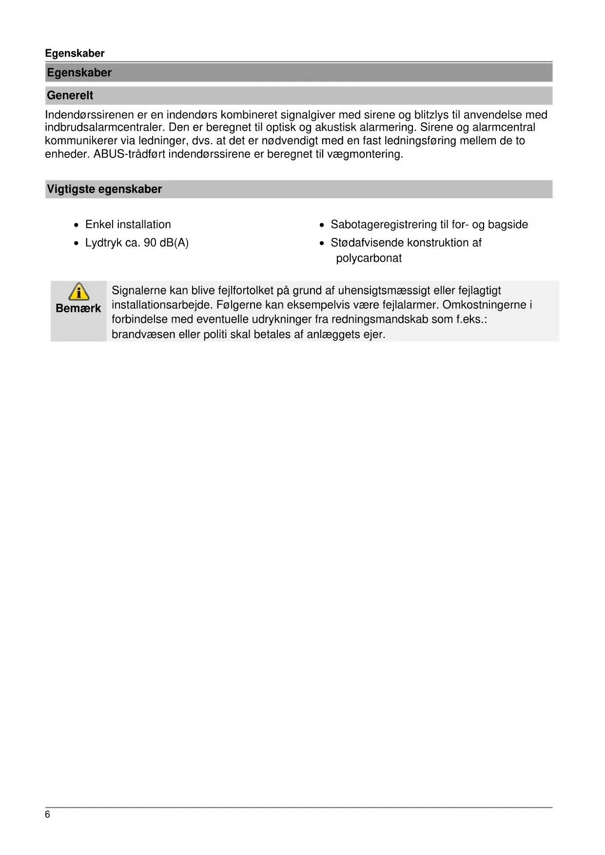 Egenskaber Generelt Indendørssirenen er en indendørs kombineret signalgiver med sirene og blitzlys til anvendelse med indbrudsalarmcentraler. Den er beregnet til optisk og akustisk alarmering. Sirene og alarmcentral kommunikerer via ledninger, dvs. at det er nødvendigt med en fast ledningsføring mellem de to enheder. ABUS-trådført indendørssirene er beregnet til vægmontering. Vigtigste egenskaber Enkel installation Sabotageregistrering til for- og bagside Lydtryk ca. 90 dB(A) Stødafvisende konstruktion af polycarbonat