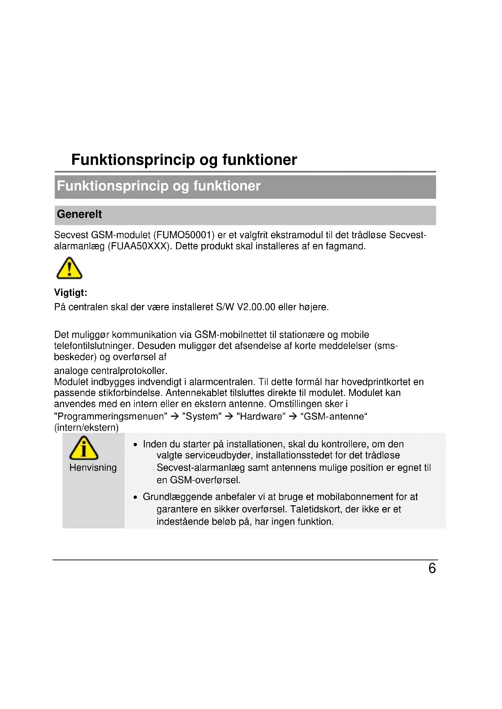 Henvisning Inden du starter på installationen, skal du kontrollere, om den valgte serviceudbyder, installationsstedet for det trådløse Secvest-alarmanlæg samt antennens mulige position er egnet til en GSM-overførsel. Grundlæggende anbefaler vi at bruge et mobilabonnement for at garantere en sikker overførsel. Taletidskort, der ikke er et indestående beløb på, har ingen funktion.Funktionsprincip og funktioner