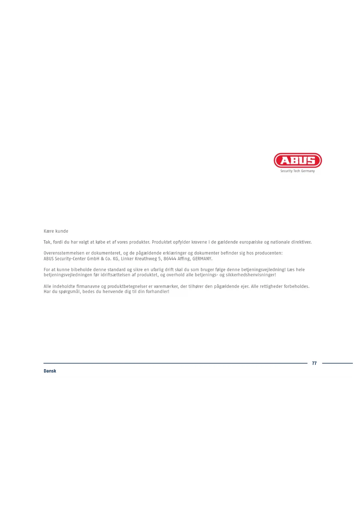 Denne kvikguide beskriver de første opsætningstrin for din IP-optager. Detaljerede informationer ndes i den betjeningsvejledning.77 Dansk Kære kunde Tak, fordi du har valgt at købe et af vores produkter. Produktet opfylder kravene i de gældende europæiske og nationale direktiver. Overensstemmelsen er dokumenteret, og de pågældende erklæringer og dokumenter bender sig hos producenten: ABUS Security-Center GmbH & Co. KG, Linker Kreuthweg 5, 86444 Ang, GERMANY. For at kunne bibeholde denne standard og sikre en ufarlig dri skal du som bruger følge denne betjeningsvejledning! Læs hele betjeningsvejledningen før idrisættelsen af produktet, og overhold alle betjenings- og sikkerhedshenvisninger! Alle indeholdte rmanavne og produktbetegnelser er varemærker, der tilhører den pågældende ejer. Alle rettigheder forbeholdes. Har du spørgsmål, bedes du henvende dig til din forhandler!78 Dansk